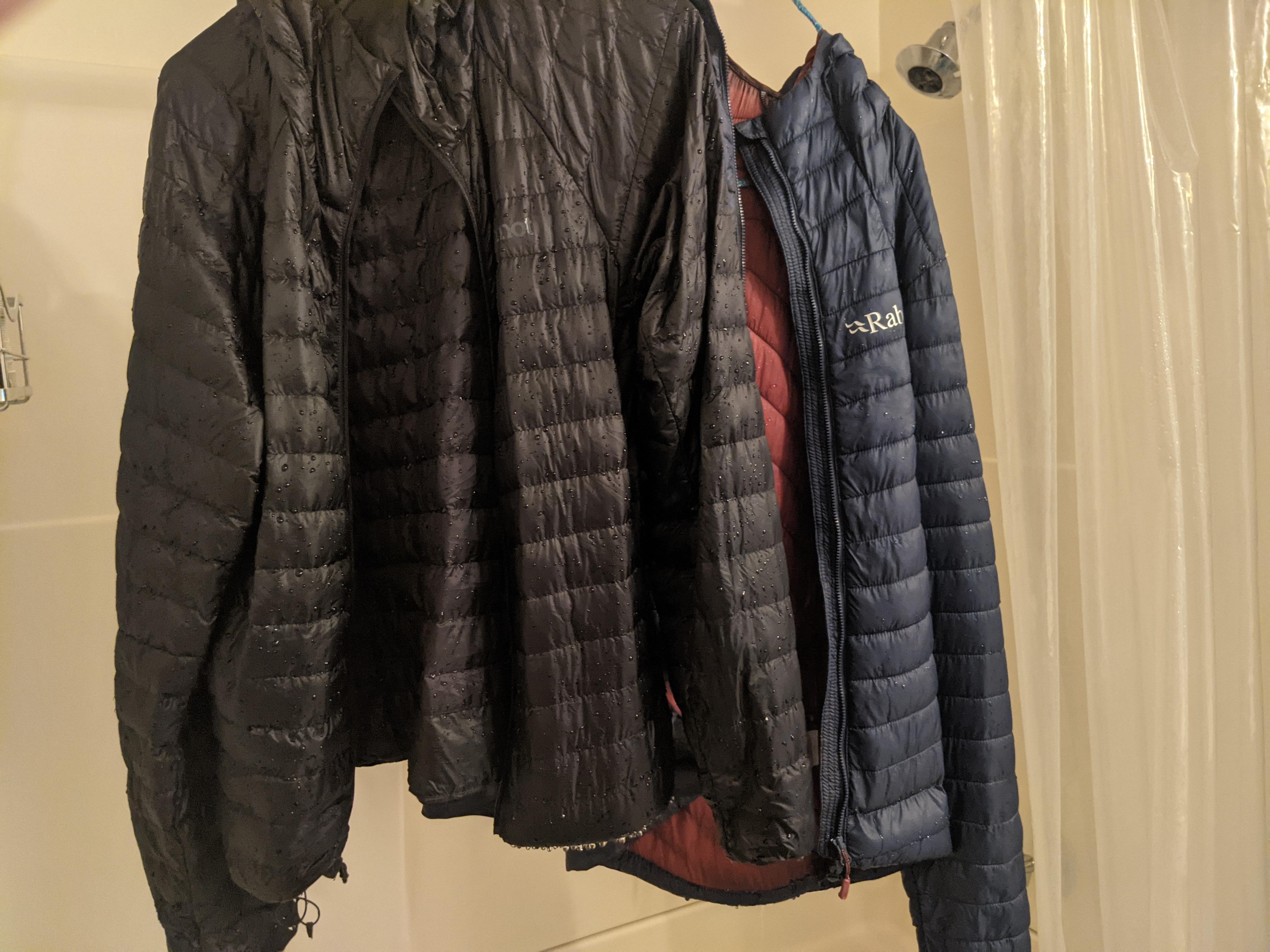 Part of this is certainly that the DWR treatment (both PFAS free in this case) of today is just a lot better than it used to be, and it was taking a long time for water to penetrate that initial barrier. And while the Primaloft insulation did a superior job of lofting after becoming completely drenched, the down in the Marmot Hype — which was treated with a more permanent gold-particle tech called ExpedDry — did a heck of a lot better than I was expecting.