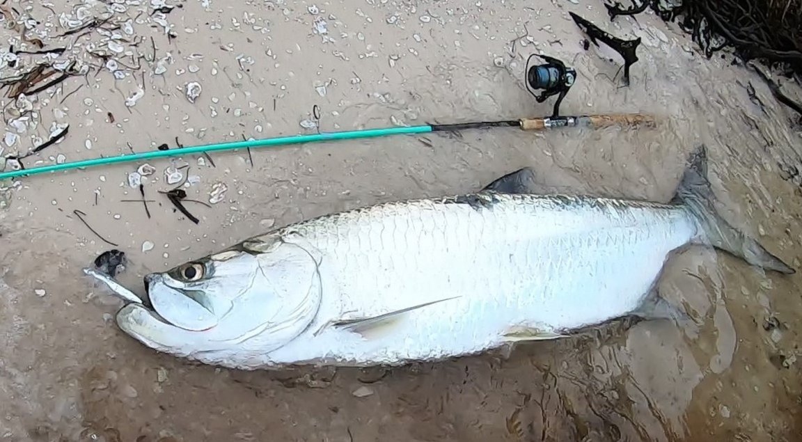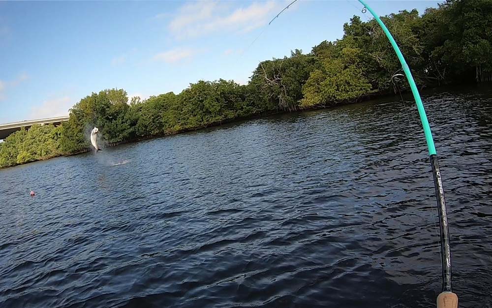 While my knowledge of tarpon fishing isn’t extensive, I know enough to understand that a 2000 size spinning reel isn’t a great choice for targeting fish in the 60-pound and heavier class but based on the success I’ve had with this reel, it’s now what I use for targeting tarpon from my kayak. My winter tarpon fishing is mostly limited to a river warmed by a power plant. The water temperature near the plant ranges from the low 70s to low 80s in the December through April timeframe, and this attracts and holds big tarpon all winter. However, these fish are very picky, and the only artificial that consistently gets interest is a 5-inch jerk shad on an 1/8-ounce swimbait hook. Making long casts with this light and less than aerodynamic lure requires using braid no heavier than 20-pound-test. Because my medium power 7-foot Tsunami Carbon Shield rods already carry Evict 2000 reels filled with 20-pound-test braid for snook, these outfits also became my tarpon outfits. In all honesty I only attempted to tarpon fish with these because I mistakenly thought that the majority of these winter tarpon were in the smaller 30-pound-class. On my first good session of putting seven tarpon in the air (and landing zero), none of the fish appeared to exceed 40 pounds. While this is still a large fish for a 2000 size reel, it’s manageable.