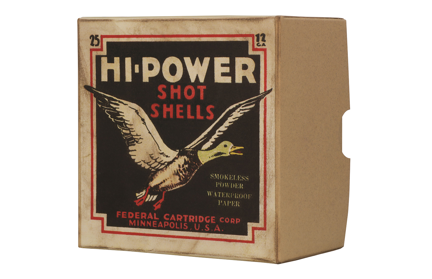 Two months after Charles Horn purchased Federal, the company’s first products were the HI-POWER shotshells from the former company. Under the HI-POWER line, Federal indicated their low, standard, and high brass loads with Dixie, Standard, and Ranger labels, respectively. The HI-POWER boxes included a black background with the company’s famous Mallard stretched across the front. In the 1930s, Federal phased out HI-POWER as an overall label, replacing it with Federal as the main branding.