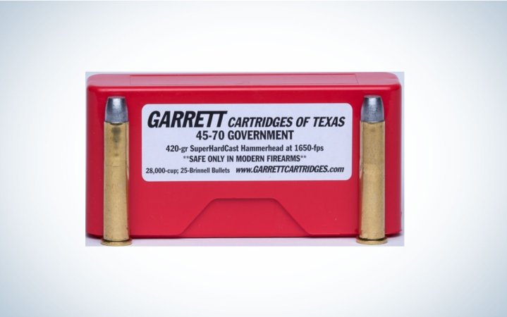 Garrett is another niche ammunition company that produces burly loads for the .45-70. They load their 420-grain SuperHardCast bullet at several different muzzle velocities from 1,350 to 1,850 fps, so you can tailor the load to your needs. They also load other projectiles, including a 540-grain SuperHardCast, along with a couple 500-grain offerings spitting projectiles from Woodleigh and Hornady.