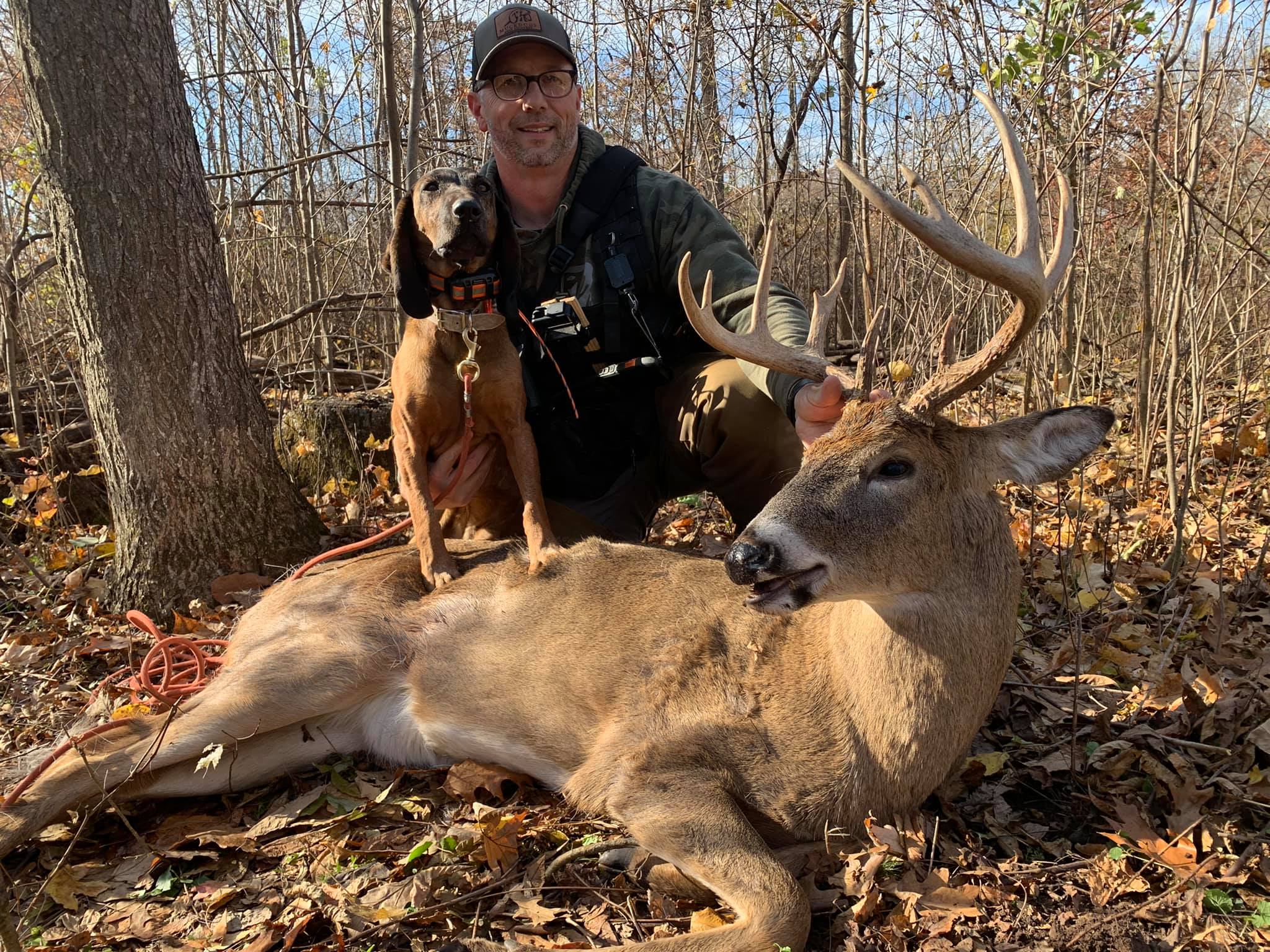 Instead of stumbling around the woods in the dark and potentially bumping the deer onto the neighbor’s property, Dahlke opted to back out and track the deer in the morning with the help of blood-trailing expert Shane Simpson. He and the dog found the buck quickly, piled up only 60 yards away from the hit site and not more than 20 yards from where Dahlke had stopped looking the night before. Luckily, the deer hadn’t been ravaged by coyotes overnight. Even after the recovery, they found not a drop of blood.