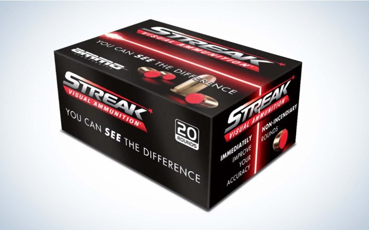 It’s a great idea to do some training in low light if you can, because it’s entirely possible a self-defense situation may take place sometime other than during broad daylight. Streak Visual Ammunition can make this more fun and productive because it acts like a tracer but is non-incendiary. So how does Streak achieve its tracer-esque performance without a fire hazard? Through patented, non-flammable technology that coats the base of the pistol bullets with a proprietary photo-luminescent compound. This compound is “charged” by the flash of the burning propellent, making the base of the bullet visible in low light and darkness while in flight. Not only is it fun, but it’s useful because you can see where you are missing, something that can often be difficult in low-light training.