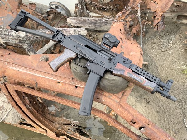 Another highly popular 9mm carbine is the AK-V 9mm from Palmetto State Armory. They offer several different variants, but I opted to test the Voodoo model with brown/green laminated furniture and a ventilated “cheese grater” style upper handguard. This braced pistol ships with a folding triangle brace, though since it features a Picatinny mount, the gun is compatible with others too. Where the Kalashnikov KP-9 strives for an authentic Vityaz look, the AK-V sports modernized lines on the dust cover and a beefier magwell and paddle mag release. It’s nicely executed.