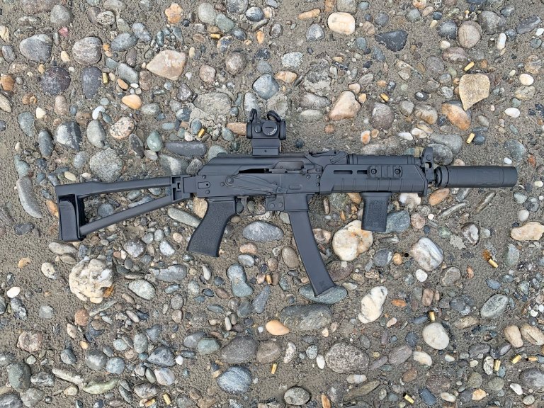 The KP-9 from Kalashnikov USA is the pistol version of the company’s KR-9 rifle — and an almost exact semi-automatic copy of the Russian Vityaz submachine gun. Bare bones, this pistol is about $1,100 to $1,200, but is compatible with triangle folding braces or stocks (if you want to register it as an SBR). It has a 9.25-inch barrel that comes with a genuine Vityaz-style compensator, but it’s threaded ½-28 making it compatible with other widely-available muzzle devices and suppressors. I fitted my personal SBR with a Silencerco three-lug mount.