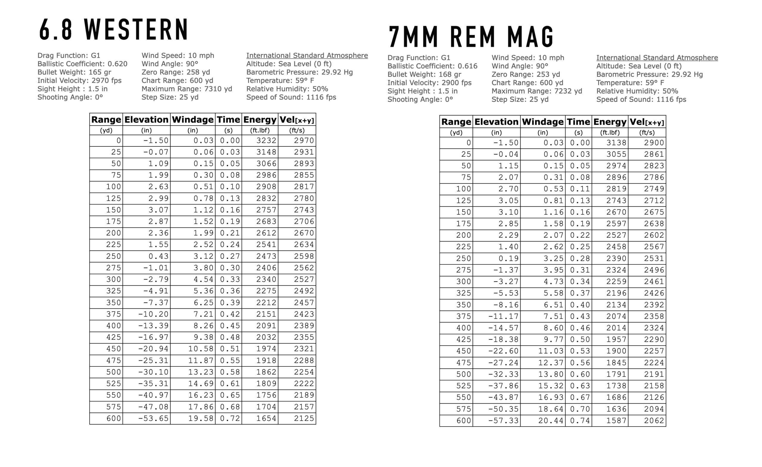 An easy way to determine this is to first know that when bullet BC and MV are the same, trajectory will be the same. Identical drop and drift. If one bullet is heavier, it will retain more energy at all distances. Recoil in same weight rifles will be close with the heavier bullet kicking a bit more. The well-known 7mm Rem. Mag. kicks out a 168-grain bullet about 2,900 fps from a 24-inch barrel. The 6.8 Western spits a 165-grain about 2,970 fps as recorded on my chronograph. Let’s go to the tale of the tape.