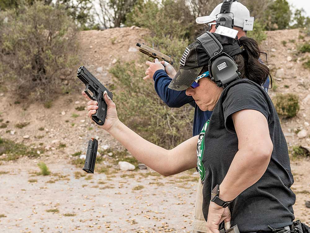 Mastering the pistol reload is a subject unto itself, but the biggest takeaway for a smooth reload is to go slow enough to do it correctly. You’ll never cut time by fumbling. Also, position your magazines so that they’re easy to grab, and index them so that the bullets are facing in a direction that doesn’t require extra movement to turn and load them into the gun.