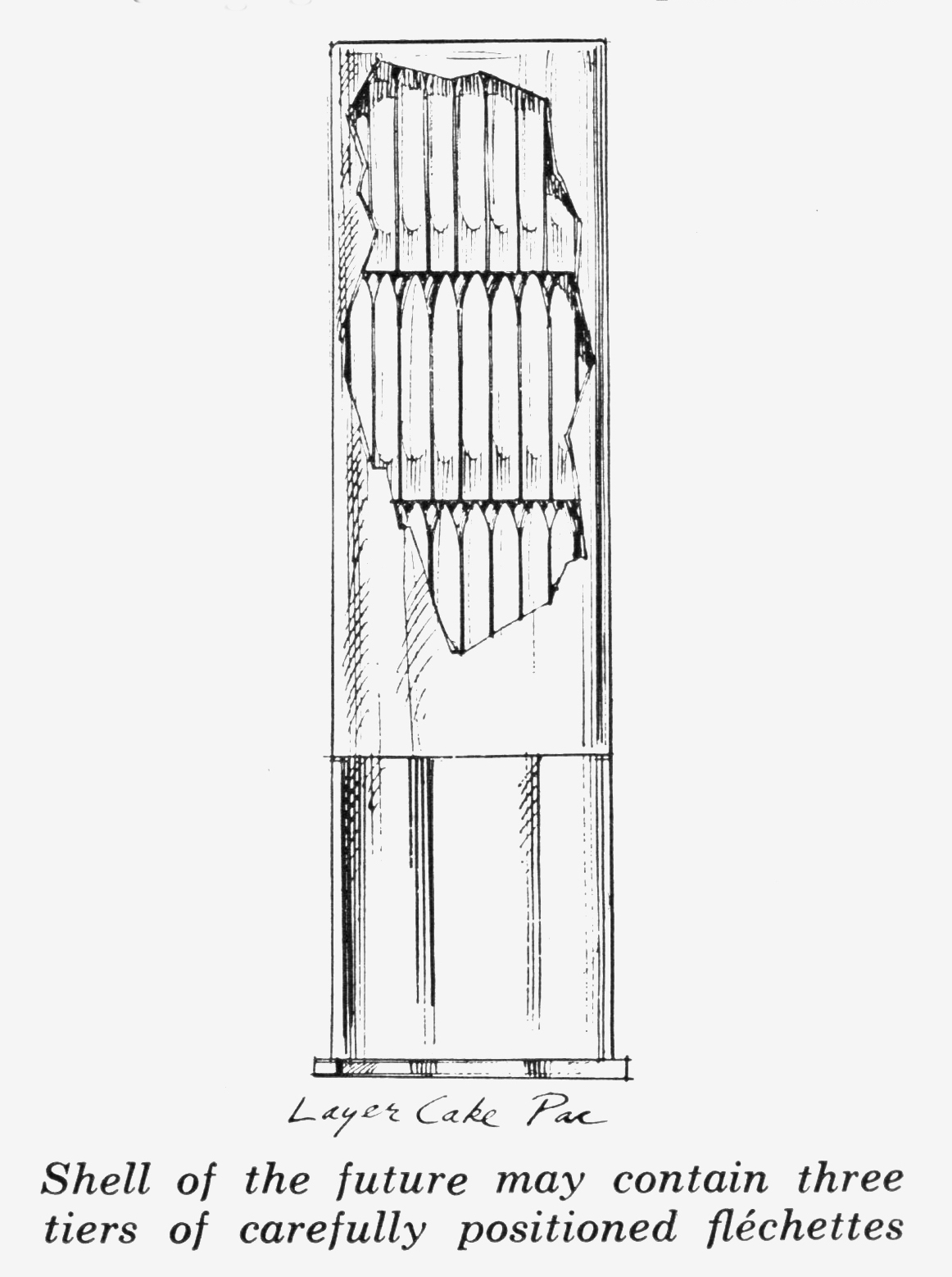 But teardrop shot may be difficult to make. A shape that would be easier to make as well as be of superior ballistic efficiency is a fechette or small dart. Pointed on one end with a pressed, arrowlike fletching on the other, the darts fly point-on and thereby lose their velocity and energy less rapidly than a sphere. This means greater punch at longer ranges-ranges we now con sider all but impossible.