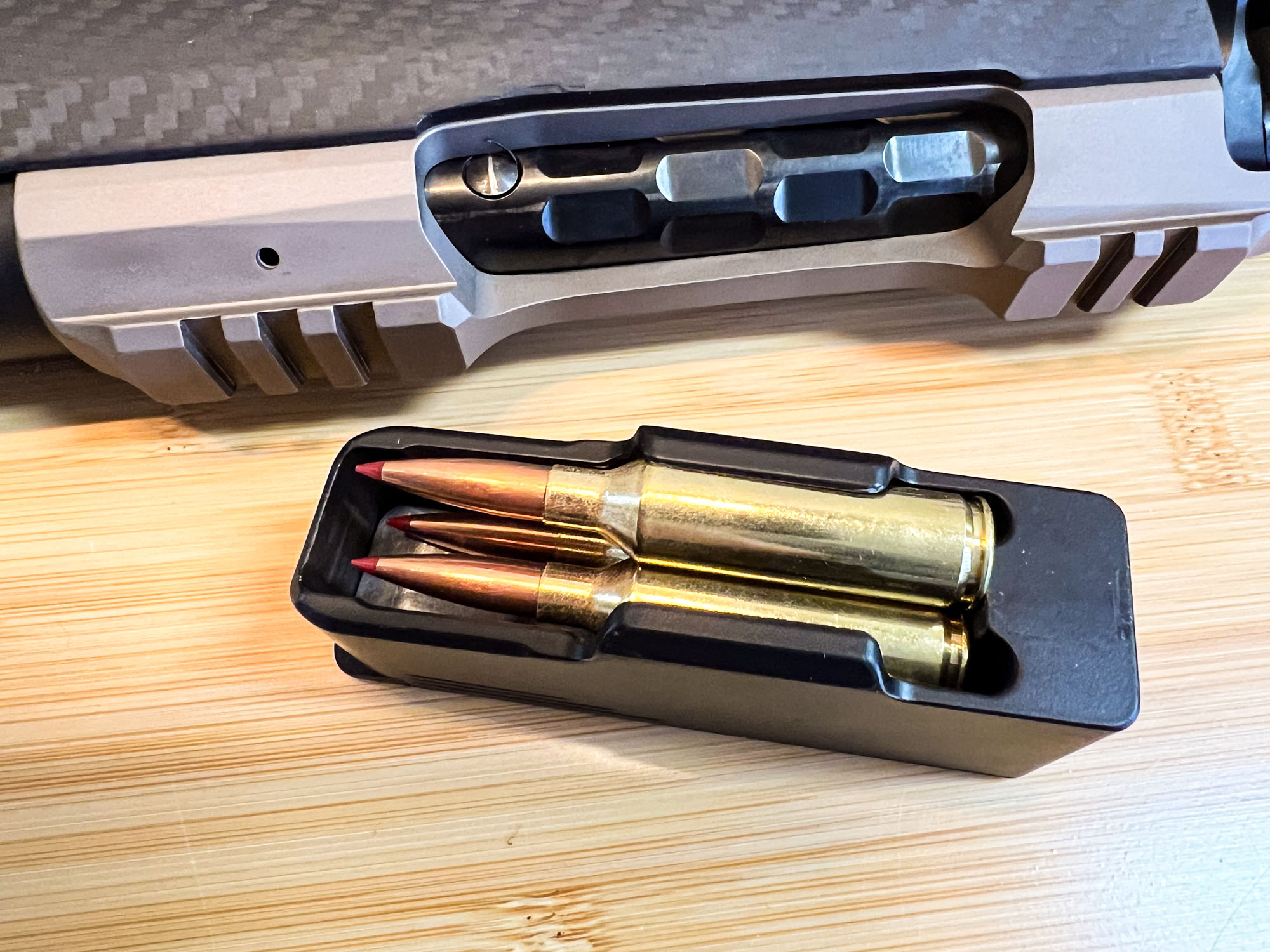 Because it fits flush with the bottom of the rifle (actually the full-length ARCA rail), the magazine enhances the rifle’s carrying and handling qualities, while still managing to hold 3+1 rounds of the chunky 6.5 PRCs.