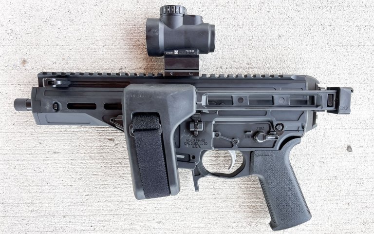 With the brace closed the Nemo Arms Mongoose measures just 14.5 inches and it tips the scales at 4 pounds, 10 ounces with the Trijicon MRO aboard. In its folded configuration it is easy to transport in a bag or stash in a vehicle. For a portable PDW and truck gun it is an excellent option.