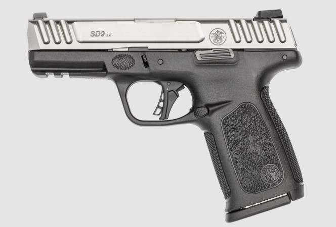 Smith & Wesson rolled out an updated version of its SD9, a budget-priced striker-fired pistol, in December 2023. This is a pretty straightforward polymer-framed pistol with good ergonomics, a 16-round capacity, and some nice white 3-dot iron sights. It has a two-tone finish, and some updates include a flat trigger shoe and more aggressive slide serrations. It’s got a small magazine release that’s nicely protected by a raised portion of the grip, flush-fitting magazines, and a two-slot accessory rail. At a street price of about $300, it’s one of the most affordable quality handguns from SHOT Show 2024.