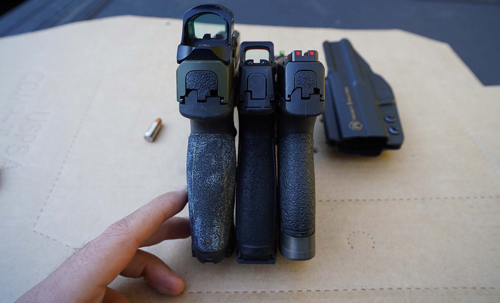 You can customize the grip size by swapping the three included backstraps (small, medium, large). The backstraps and the majority of the grip have a texture that strikes a nice balance between grippy without being abrasive. I’ve shot the XMacro in the pouring rain and never lost my grip with wet hands.