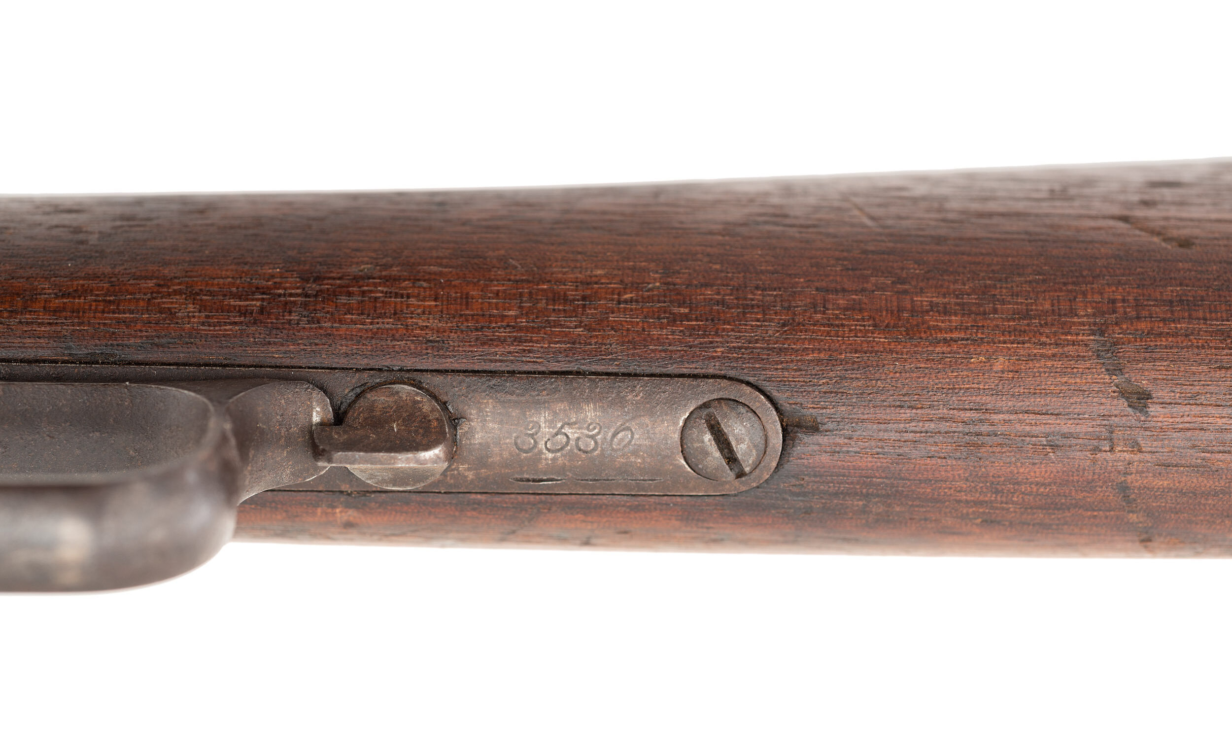 The condition of the 1876 is good considering its age. The metal has a moderately oxidized plum patina mixed with gray, which shows some evenly scattered surface roughness and pitting. And the barrel markings have some wear. While it is mechanically functional, the poor bore is dark, dirty, and heavily oxidized with weak rifling. The wood is lightly sanded with moderate wear and the fore-end has chips and loss along the upper edge and is somewhat loose on the frame. There is a diagonal crack on the obverse running from the nose cap. There are scattered bumps, dings, and mars as would be expected with a rifle this old.
