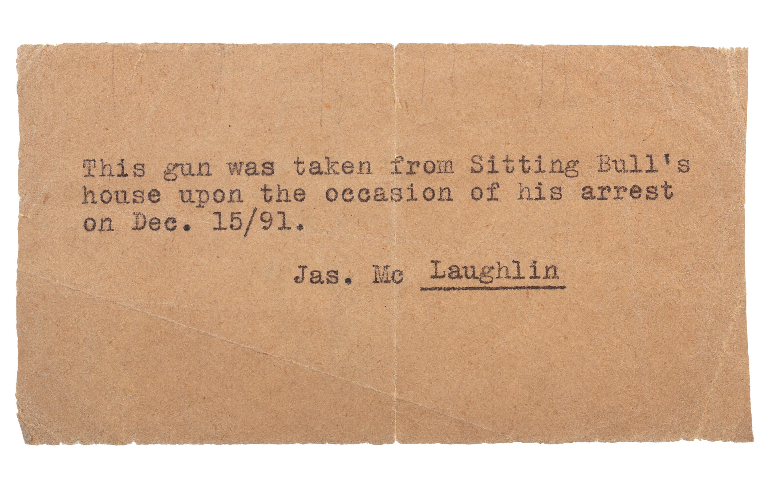 Historical records indicate several firearms were removed from Sitting Bull’s cabin at the time of his death and were turned in to, or later acquired by McLaughlin. One of McLaughlin’s personal notebooks identifies “Guns turned in and captured by Indian Police subsequent to Dec. 15th 1890” including three identified directly to Sitting Bull.