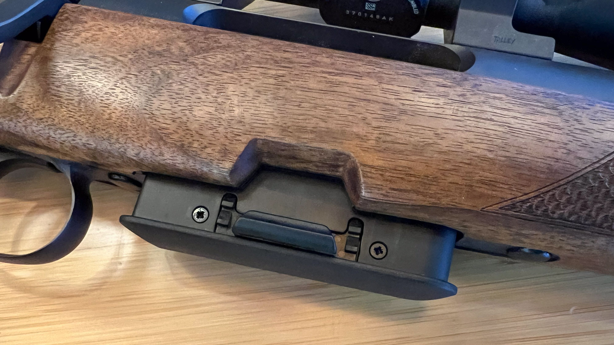 The other feature on the rifle that makes it bench friendly is the two-position magazine. When inserted fully the magazine operates normally, but you can push the release tabs on either side of the magazine and lower it by about 5mm (.19 inches) to a second setting. When in this position the bolt won’t pick up the top round in the magazine allowing you to single-load rounds instead.