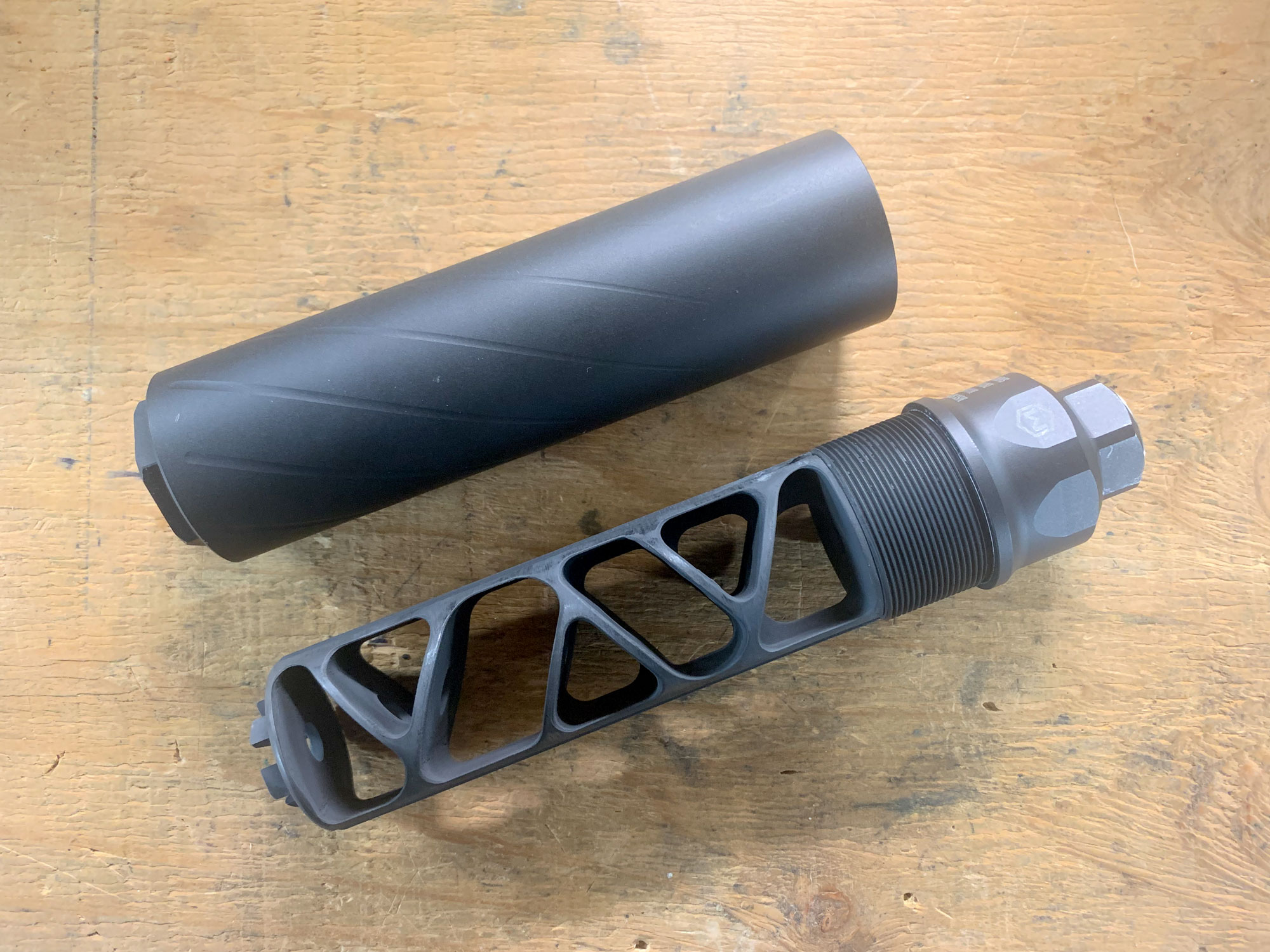 The Hybrid 46 uses multiple materials, and consists of a welded baffle stack that threads into an exterior tube. It’s closed up on the front with interchangeable endcaps, and a standard HUB thread at the rear. This design provides the ultimate versatility, and I’ve used mine on just about everything imaginable. Newer models like the Hybrid 46M and similar .36-cal Omega 36M offer improved modularity, but the original Hybrid 46 is tough to beat for both price and HUB compatibility.