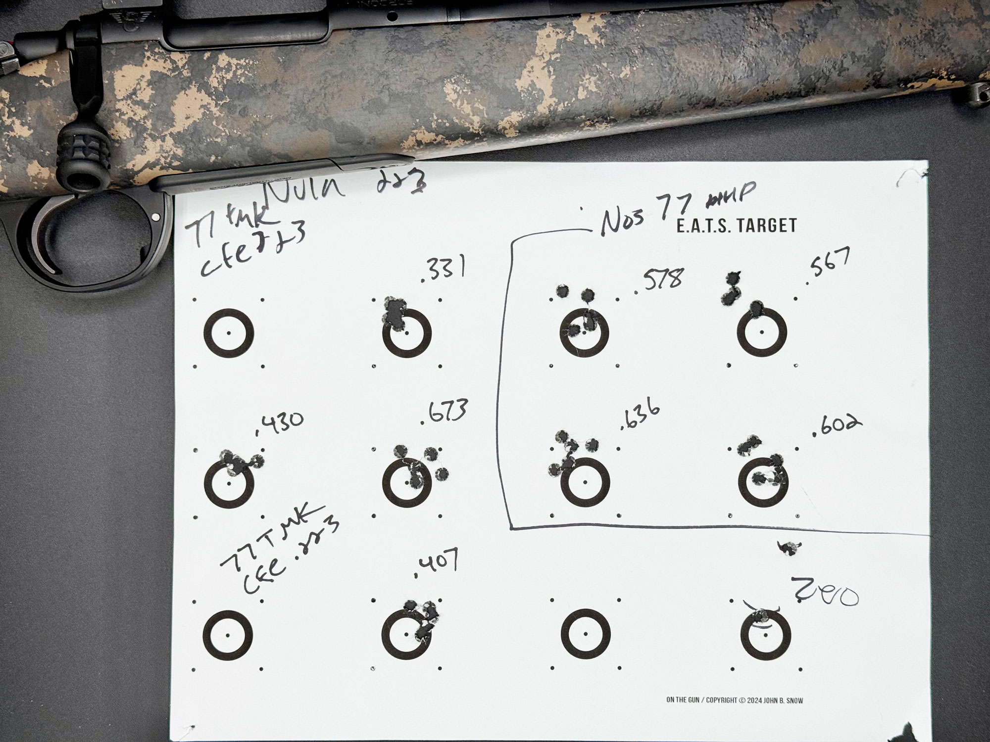 | Nosler 77-grain Match BTHP | 0.60 inches | 0.95 inches | 0.28 inches | 2,420 fps |