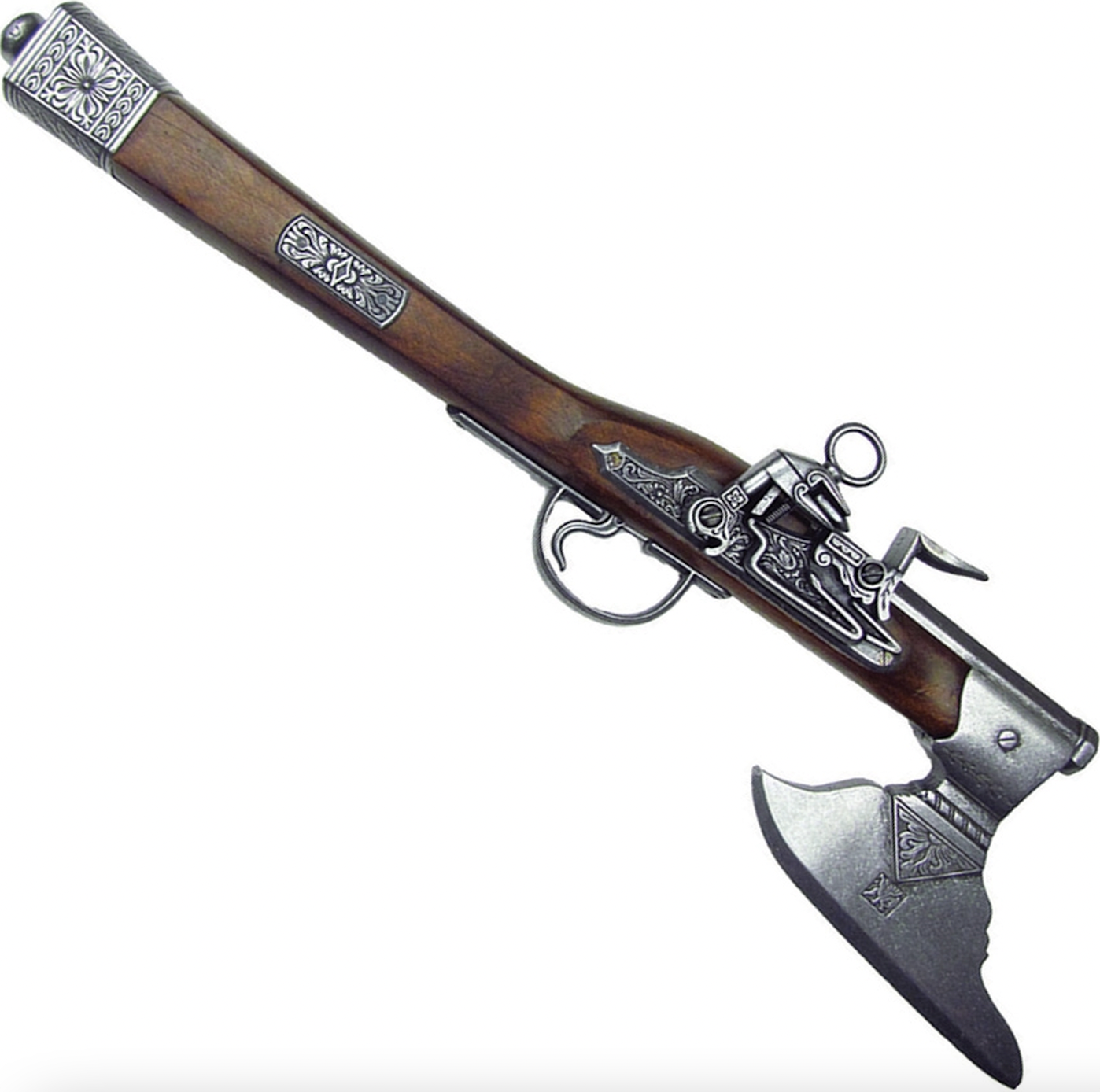 Combination weapons were extremely popular, especially in the early stages of firearms technology. But the idea that combining two weapons creates a better one is not always true. Axe pistols were developed and used by the Polish and in the Swedish cavalry in the 1700s. They saw a much greater adoption than other combination blade guns, but the balance of this gun could not have been very good. I’ve handled several of these, and have noticed that where the axe head sits (at the rear of the breech or off the muzzle) can impact the shooter’s ability to aim and fire with any amount of accuracy. The result of any sword-gun or axe pistol is a heavier-than-necessary gun with a stock shape that’s awkward for traditional sword or battle axe wielding.