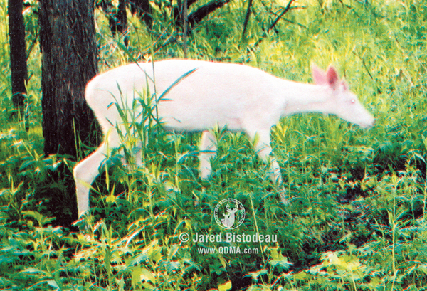 Both piebald and albino deer display genetic anomalies that occur rarely in all deer populations. True albino deer lack skin and hair pigments and are completely white. Their eyes are tinted pink.