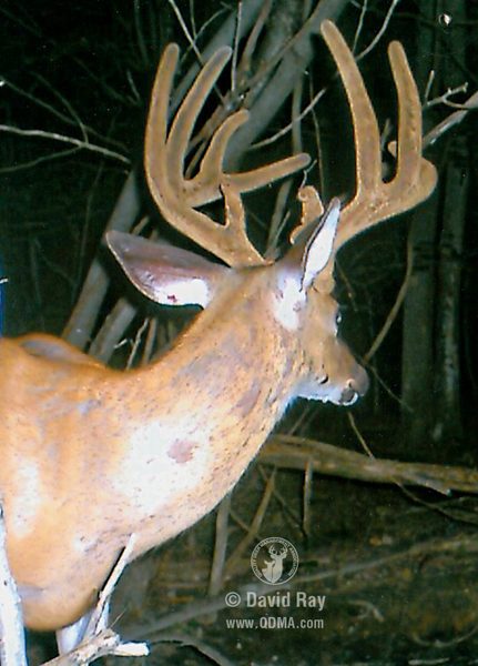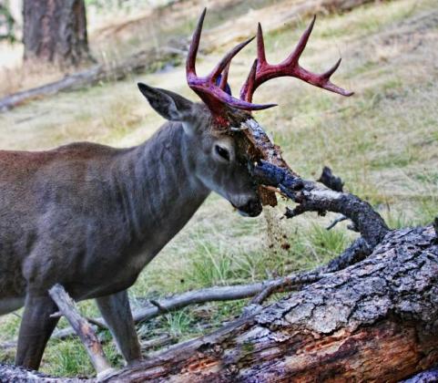 This buck is in the process of rubbing off his velvet. When he’s done rubbing, he licks the blood from his antlers off of the branches.