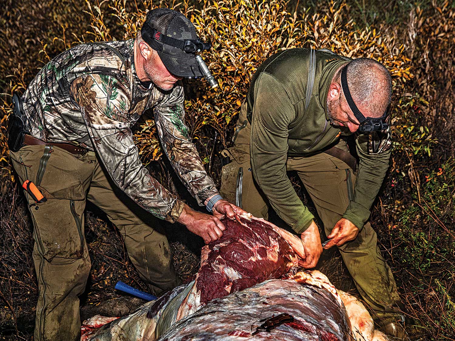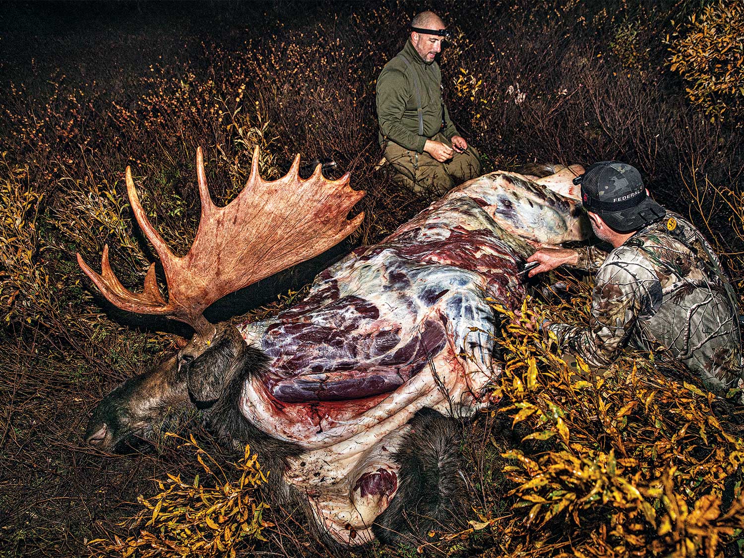 Eventually, we found the moose and got to work. It was a long, wet night. A pea-soup fog rolled in and gave the kill site an otherworldly feel. We managed to get the hide off, the moose quartered, and the first loads—the rear hinds—strapped to our backs. The fog rendered our headlamps nearly useless, blinding us more than lighting our way.