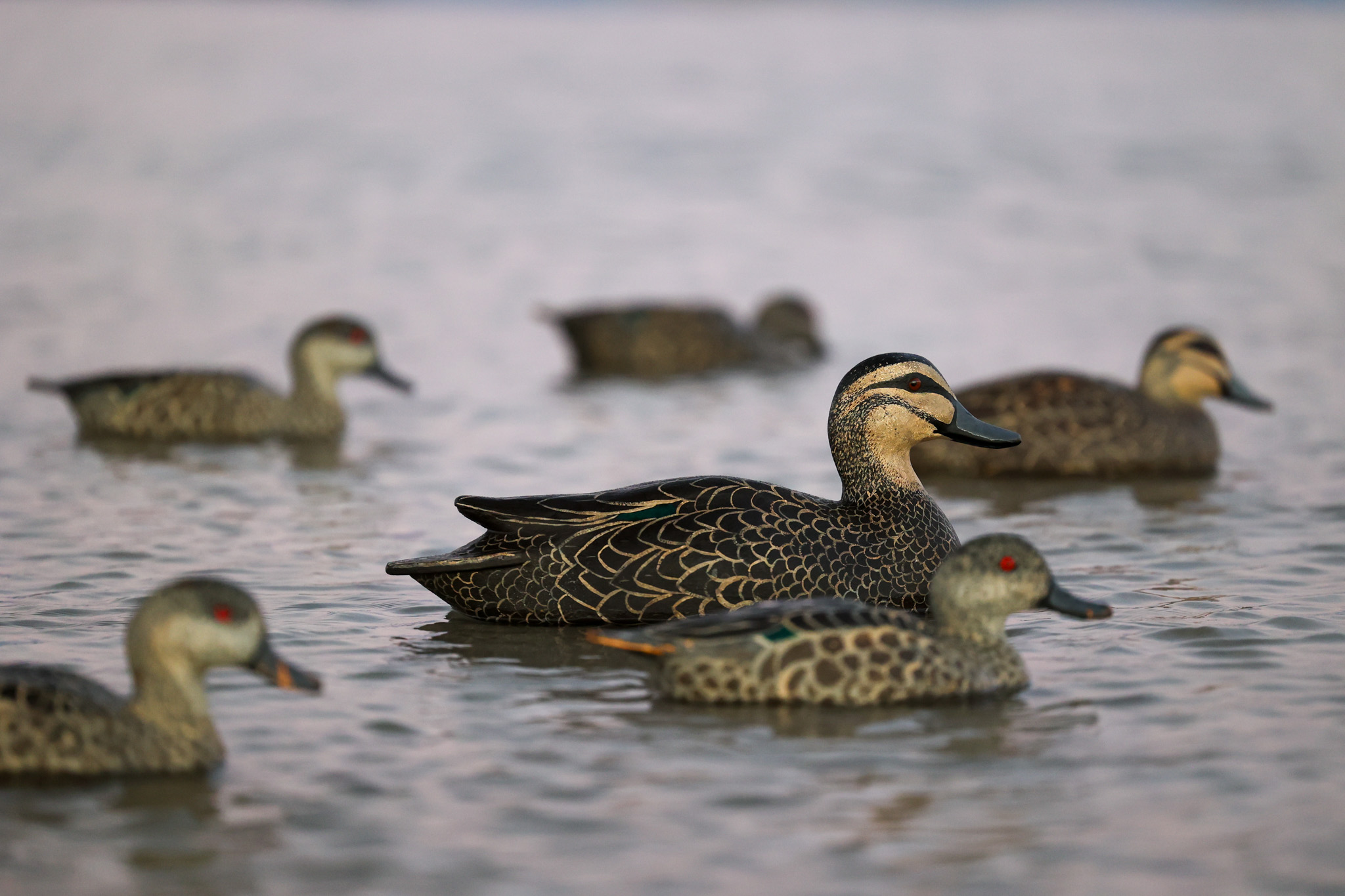 This inland alkaline lake is saltier and calmer than the nearby Pacific, and it’s incredible habitat for South Australia’s abundant ducks. Loafing birds will lift off the water all day long and cluster where fresh water trickles into the salty shoreline, producing a steady stream of ducks looking for a drink. We are on the X, and all we have to do is hunker over a pair of milk crates among the silos and wait.