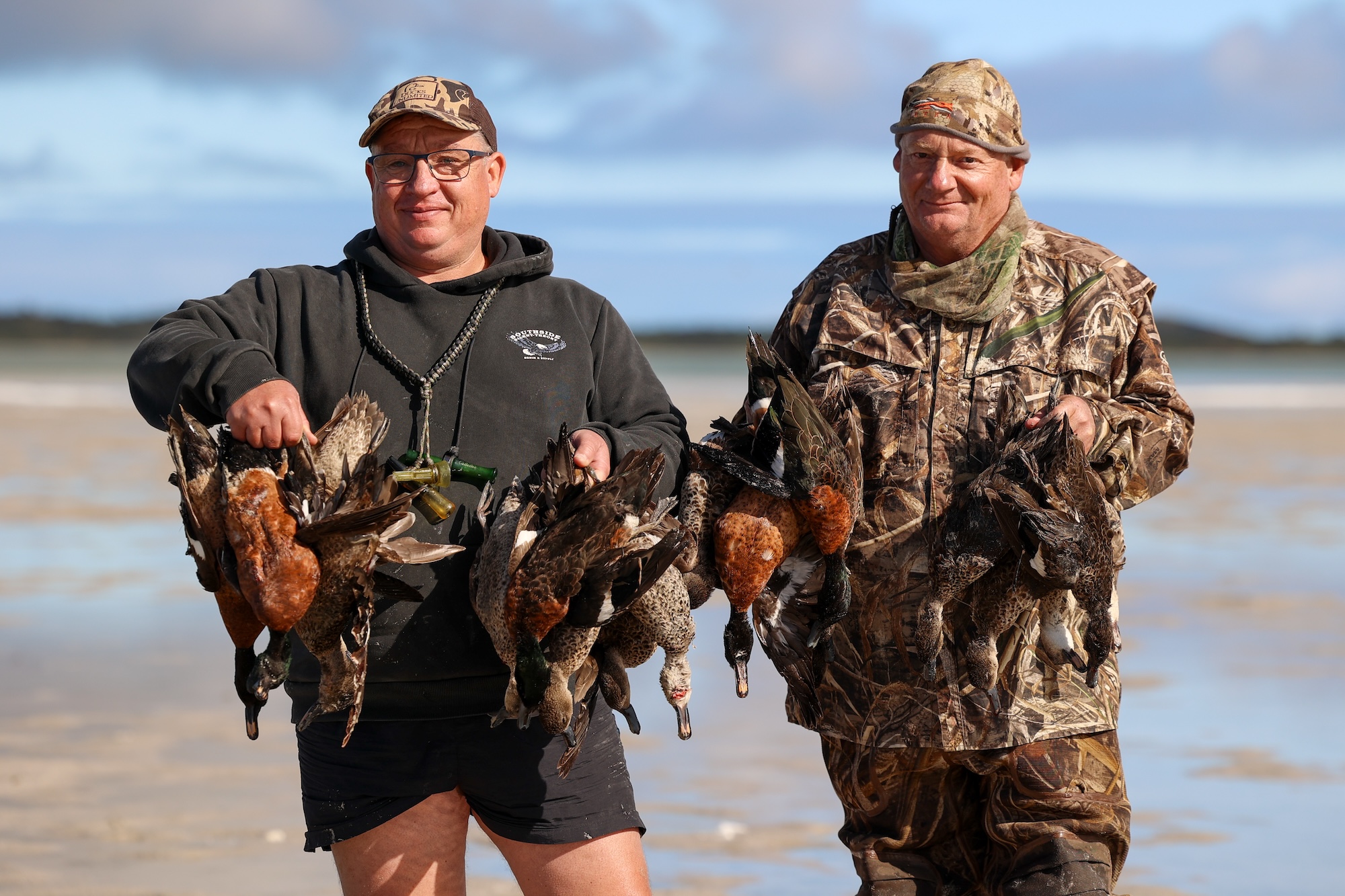Four teal break off a big mob and fly up the guts of the spread. One pair breaks left and Falla stones both in neat succession; the second pair breaks right and Sharp does the same, though he doesn’t immediately see Falla’s ducks dead in the sand.