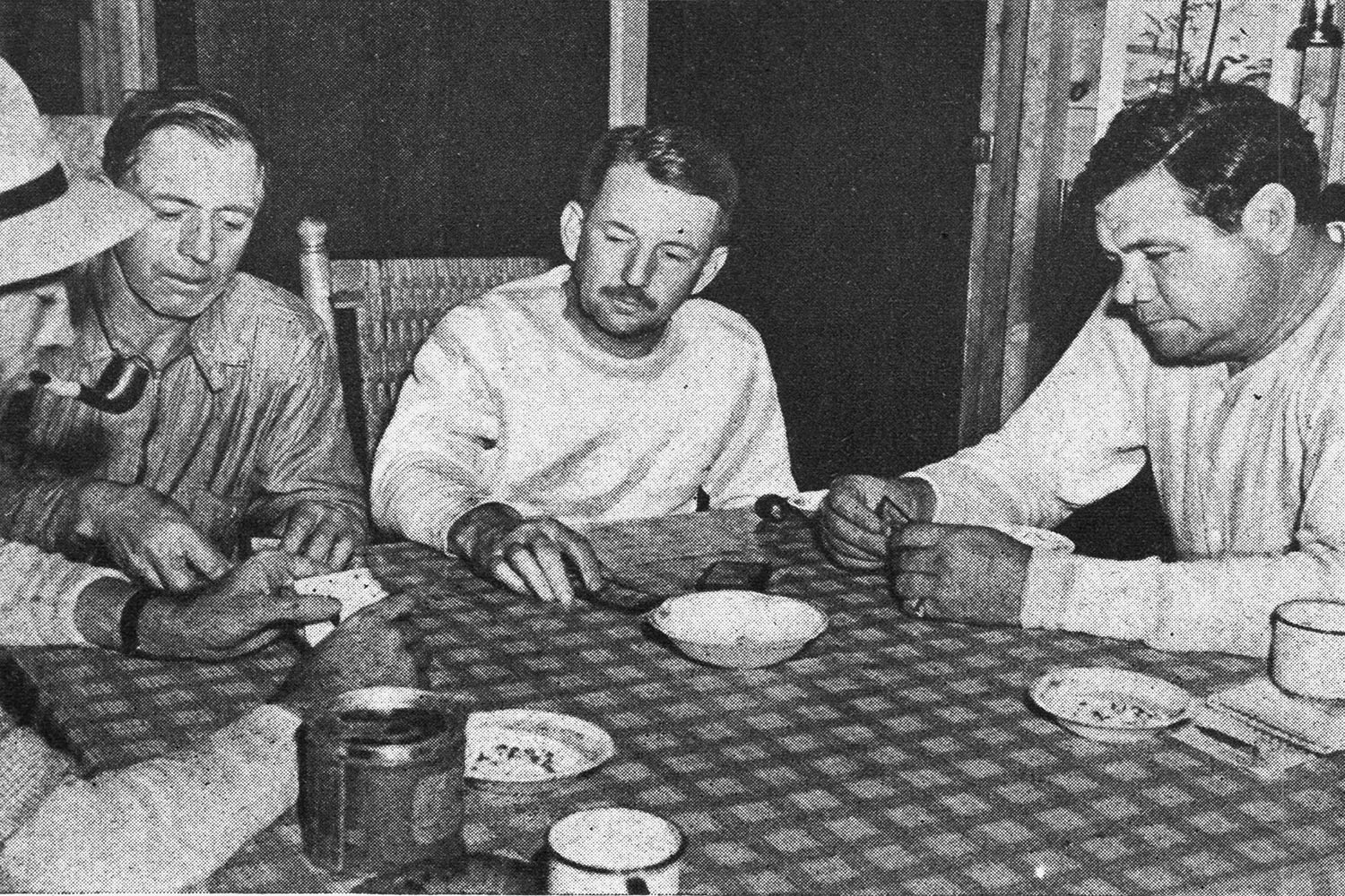 That night in camp, talk raged. The Babe loosened up, and told endless yarns of his days on the diamond, and of his hunting. He loves to hunt and used to own a hunting preserve on a farm in Sudbury, Mass., but sold it. He is fond of hunting quail in the Carolinas and Georgia, and makes many trips South. In spring and summer he likes to fish. In between, he plays thirty-six holes of golf every day. Those sports, with some radio work and personal appearances, keep him busy and happy. He enjoys life and lives it to the full. He wastes no time grieving over the fact that he’s out of baseball, for he’s having too good a time. Frank Stevens, caterer at New York’s ball parks, and Howard Chandler Christy, the artist, are his favorite hunting companions, and they’re together a lot. In his New York home, he has the walls lined with hunting trophies.