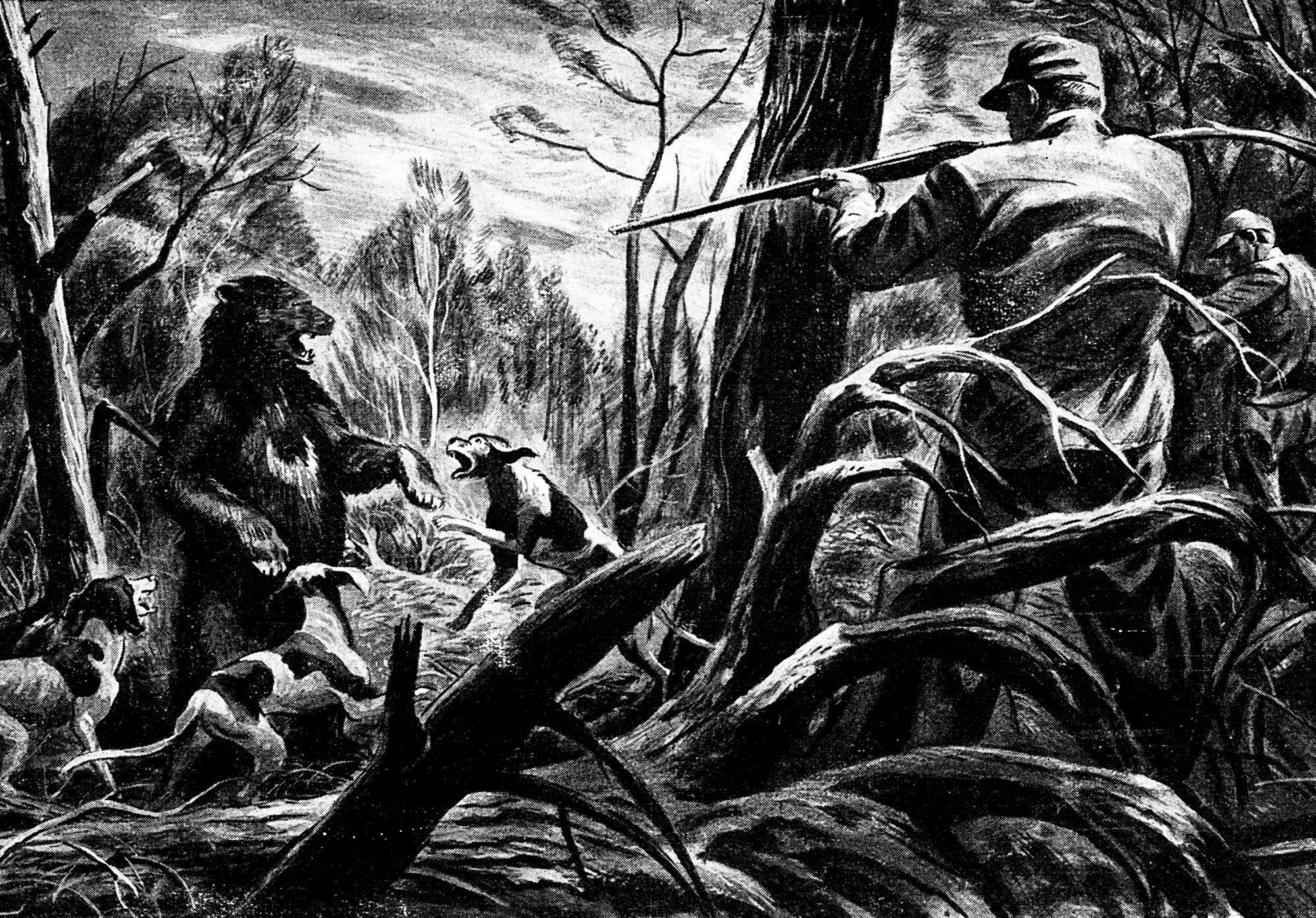 When we got to the edge, a big stump in my way made me drop behind Temple. A few steps more, and we could see into the thicket where the bear was making its last stand. Reared up on its hind legs, it was snarling and cuffing at the worrying hounds.