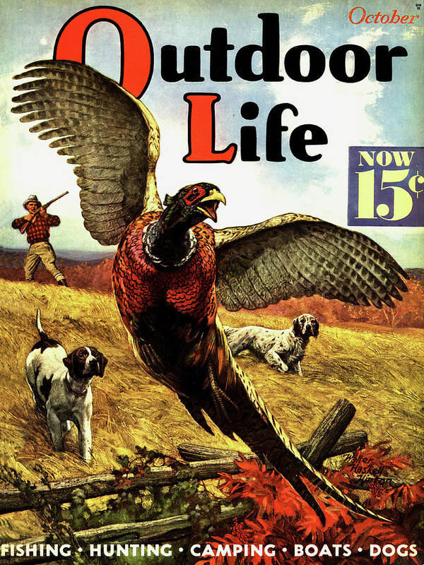 We crossed a pasture without finding birds, then came to a ditch grown up with weeds and brush. Harold took one side with Bill, while Clyde and I took the other with Freckles. Before he had gone half the length of the ditch, Clyde’s dog made game in a patch of thick cover, pussy-footed ahead a few steps, and stiffened out on a hot scent. A moment later the bird tried a get-away. We heard the flailing of wings in the grass ahead of the setter, then an outraged cackle of alarm and resentment. A big cock pheasant burst out, his white collar and chestnut breast gleaming in the morning sun as he climbed to clear the trees along the ditch bank.
