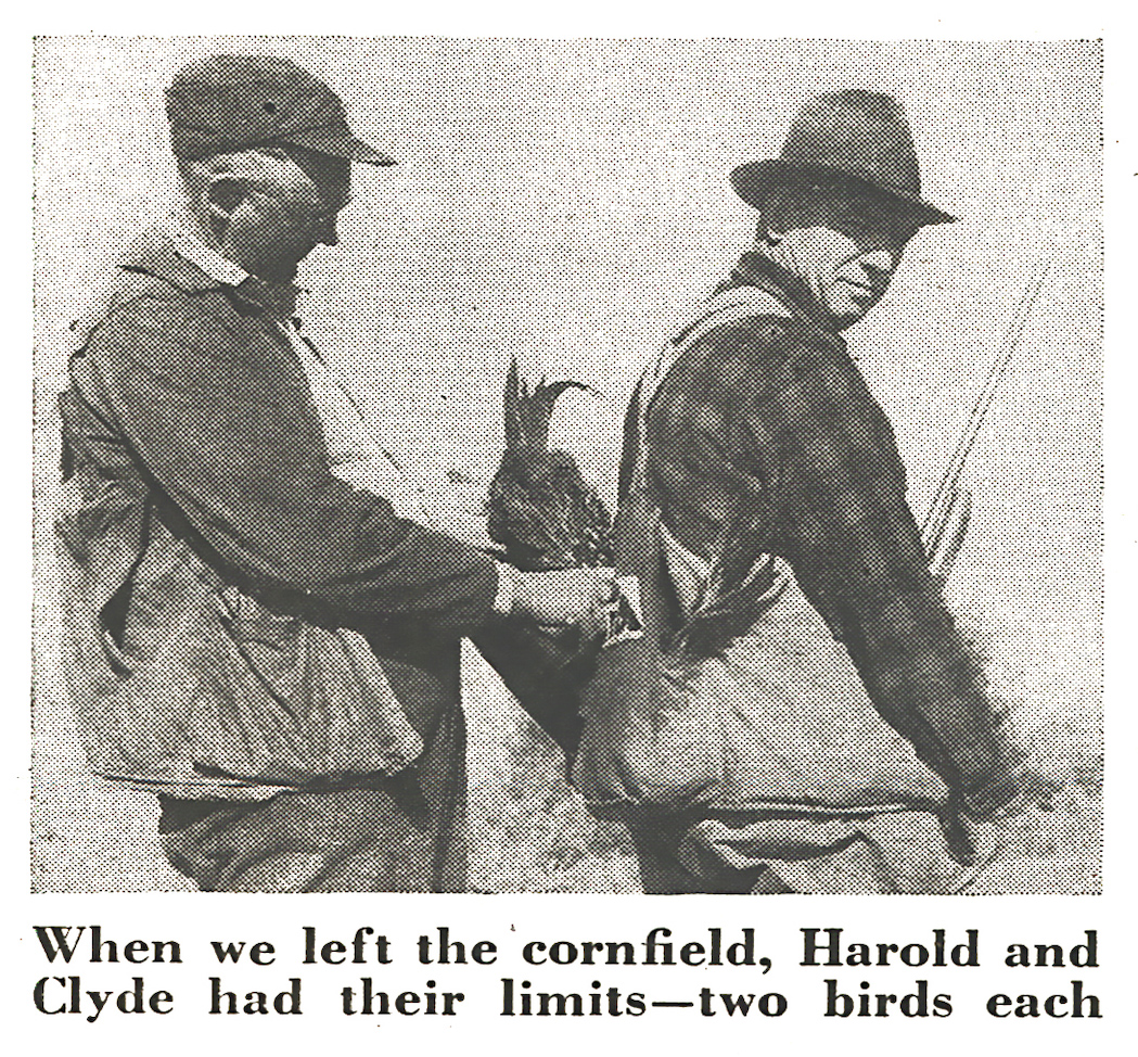 Just before we went back to the car for lunch, Bill gave Harold a chance at a handsome cock bird near the edge of a cornfield. Harold made good. But even with that, our kill of two birds for the forenoon was hardly what you could call impressive.