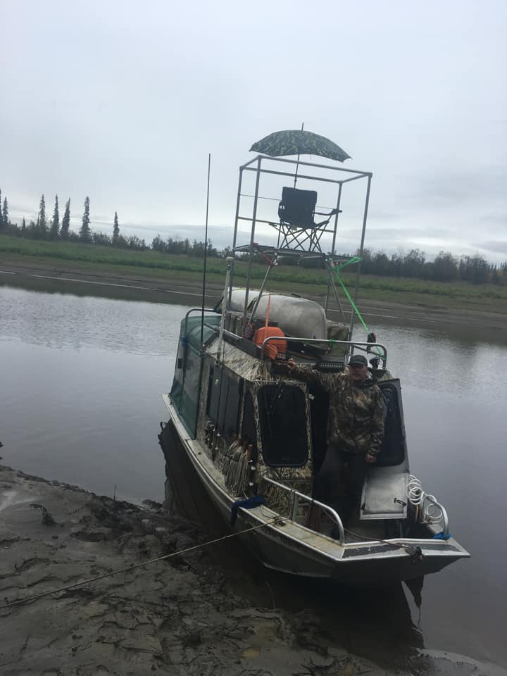 There is plenty of moose country that is best accessed by river. This boat was built by Whitewater Marine in 1980 and its owner has been improving it over the last four decades. It’s powered by a 351 Ford motor, and a Kodiak 3-stage Jet, with a 15-horsepower Honda for slowly cruising back sloughs. It’s designed for spending lots of time on the big river systems, with a fully-enclosed cab, and a sitting tower to help a hunter see over the tall banks while putting down back waterways.
