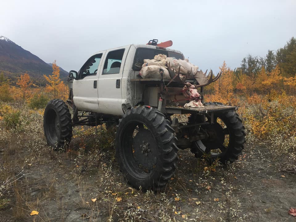 This hunter’s father and grandfather were building custom buggies back in the 1980s, and they own a full fabrication shop which has allowed them to build a fleet of custom go-anywhere moose rigs. Their current setups are built on old military deuce-and-a-half running gears with small-block Ford motors, custom axles, and differentials. They use the same drive shafts that the Monster Jam trucks use and 26I-R22 rice and cane tractor tires on custom-built wheels with spokes and outer rings. Everything except mechanical parts are made by them right in their shop. These rigs allow them to get over 40 miles off the road system and away from other hunters. They bring enough food to feed 10 to 12 people for two weeks or more, a huge basecamp tent, cook stations, generators, and freezers, as well as everything they need to cut, wrap, and freeze all their meat before they ever leave the field.