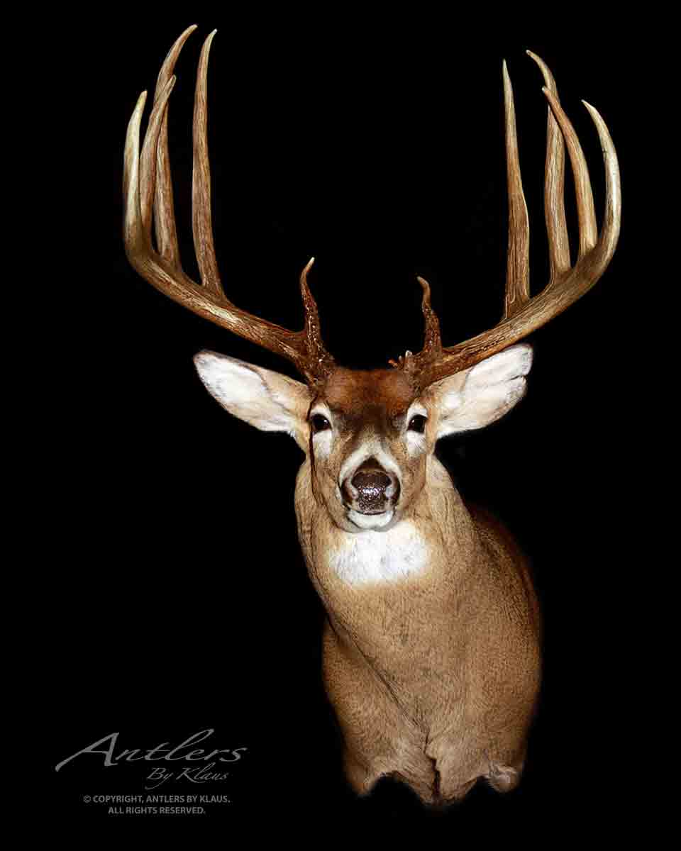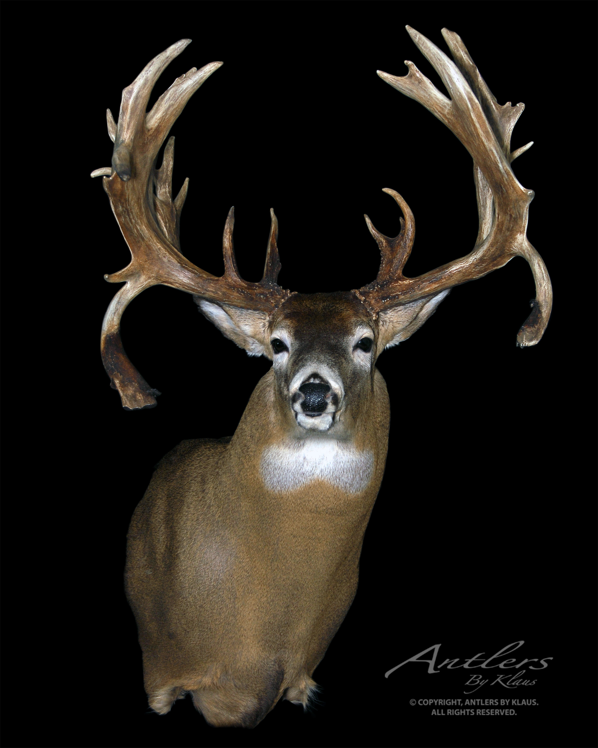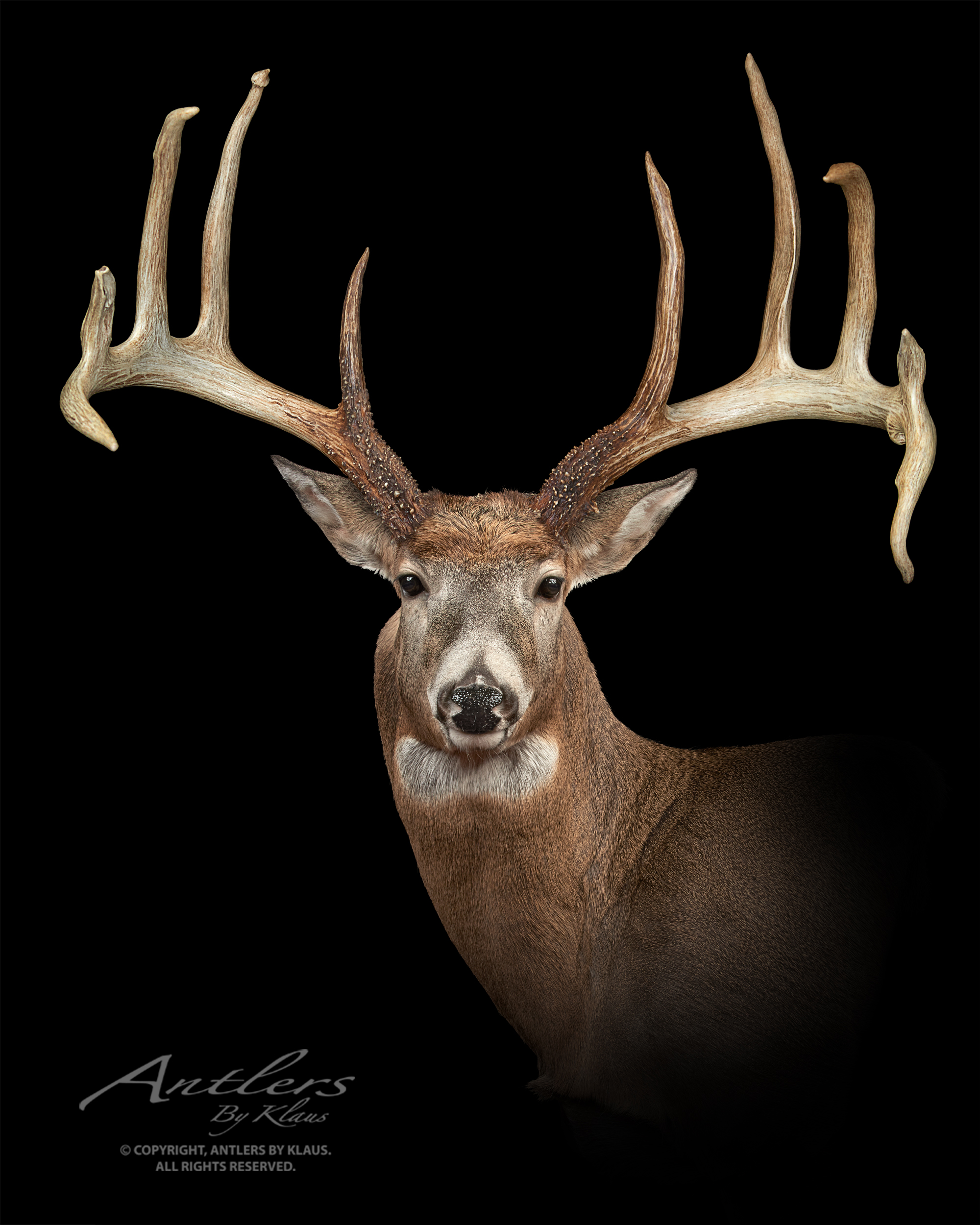 With an estimated spread of 21 7/8 inches, and a score of 232 inches, according to Klaus, the Knife-Handle set is a massive typical. Incredibly, half the left side was lost for nearly 40 years. It was believed to have been cut up into knife handles and gone forever. But in 2012 Klaus Lebrecht located the lost shed, and now the two are reunited. While it has a couple oddball points, this mostly typical whitetail is one of the largest racks on record. Unsurprisingly, it was picked up in Iowa.