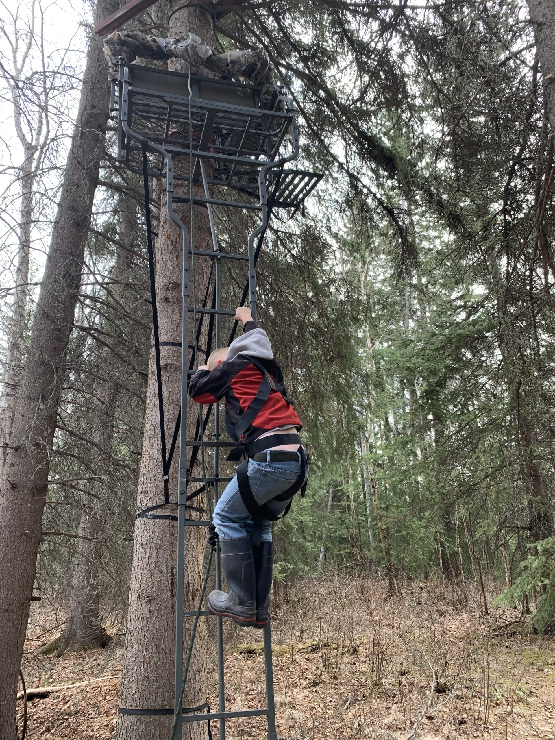 In interior Alaska, I primarily hunt bears at a bear bait site. Bear baiting is an incredibly useful management tool for areas where spot-and-stalk hunting is impractical if not impossible. It allows for good shot placement and, more importantly, selective harvest—we can focus on taking mostly boars and easily avoid shooting a sow with cubs. I usually access my baits via jet boat, so once the ice finally broke and flushed downstream, I brought Jed along to help set up our bait and tree stand. It’s important to me to introduce him to the fun of hunting, but also to all the work that goes into setting up for success.