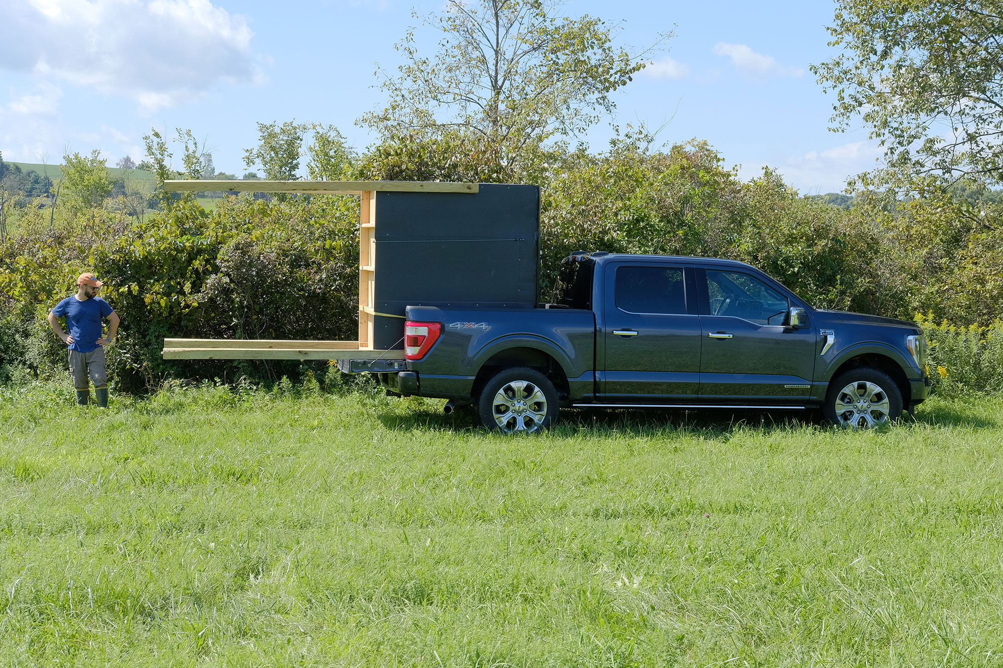 Our blind is designed to fit, tailgate down, in the smallest-available bed of a modern Ford F-150—because pretty much everybody either has one or knows someone who can loan them one. With the legs attached, it’s probably not safe to drive on the highway, but you could bump around your own property (we did, and it was fine) or cruise down a gravel road. Just make sure to strap it down really well.