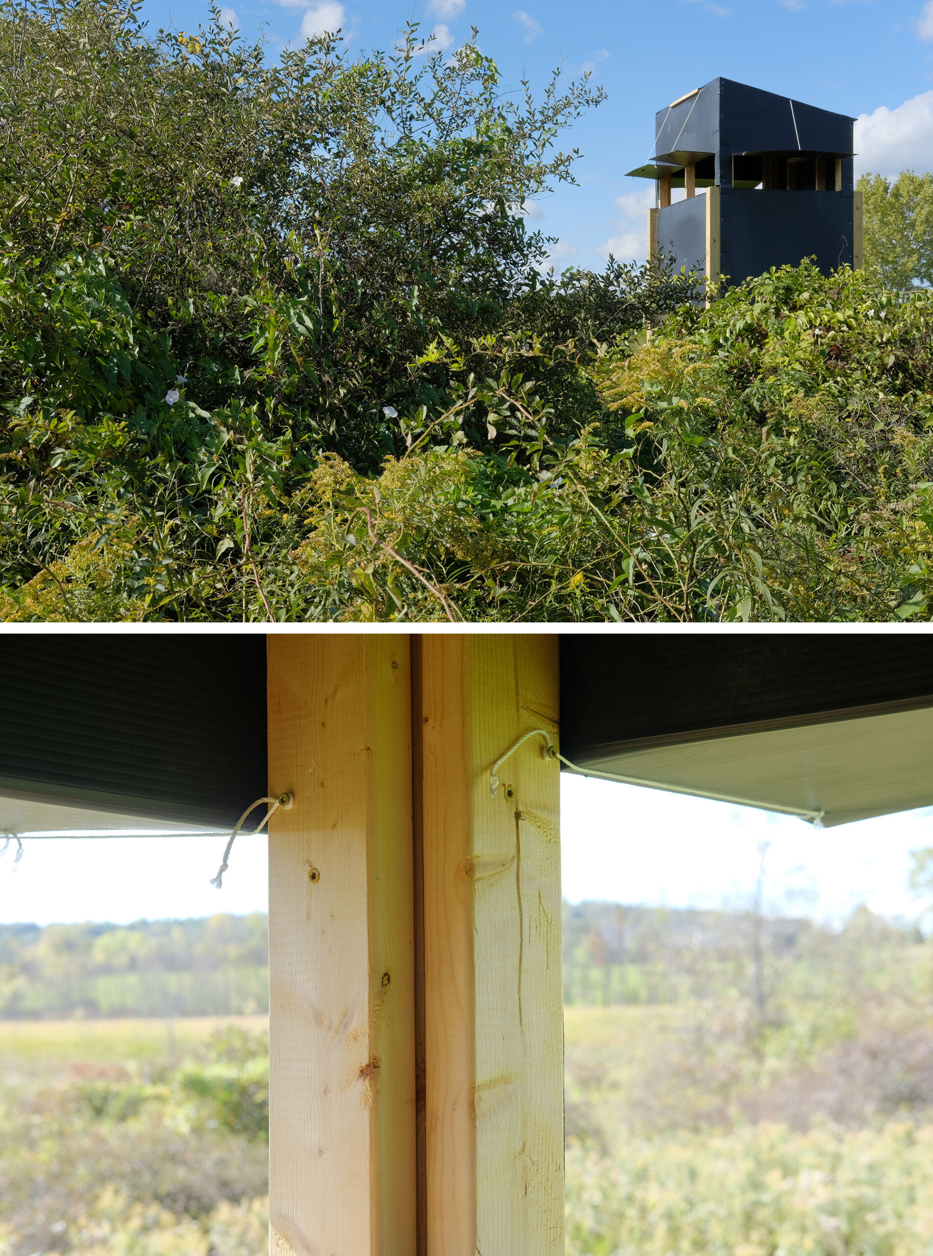 The other key aspect of our build is that it’s totally customizable. Our DJ Stand sits 7 feet off the dirt, to give us a chance at spotting the deer hiding in the tall grasses in the wetlands that snake through our properties. (We’re neighbors.) But you could easily build it to sit on the ground. Our version is for two people, but you could halve the horizontal measurements and make it a single. Ours is clad in black corrugated plastic, to retain heat and mask noise, but if you live in a warmer, drier climate, you might choose camo netting or canvas. Here’s how we did it: