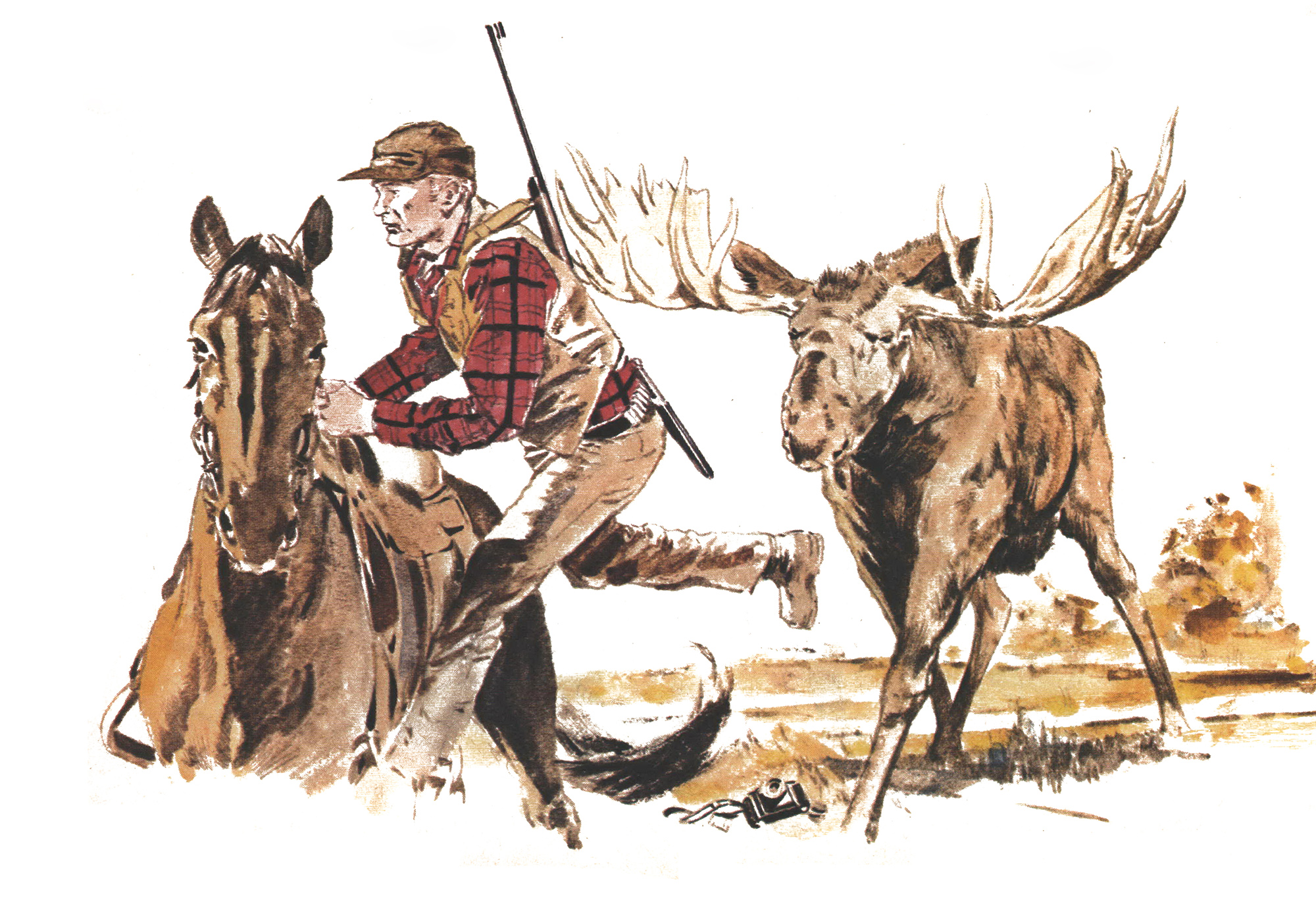 Then there was a moose I encountered in Wyoming’s Thorofare during the rutting season. I stepped off my horse to photograph a bull that stood at the edge of a swamp. He seemed placid enough, but suddenly he wheeled and made for me. Neither my horse nor I had any idea whether he had in mind to breed or to scalp us and, not particularly wishing to learn, we got out of there as though our touch holes had been turpentined. I hit the saddle with a running dive that would have done credit to a movie cowboy.