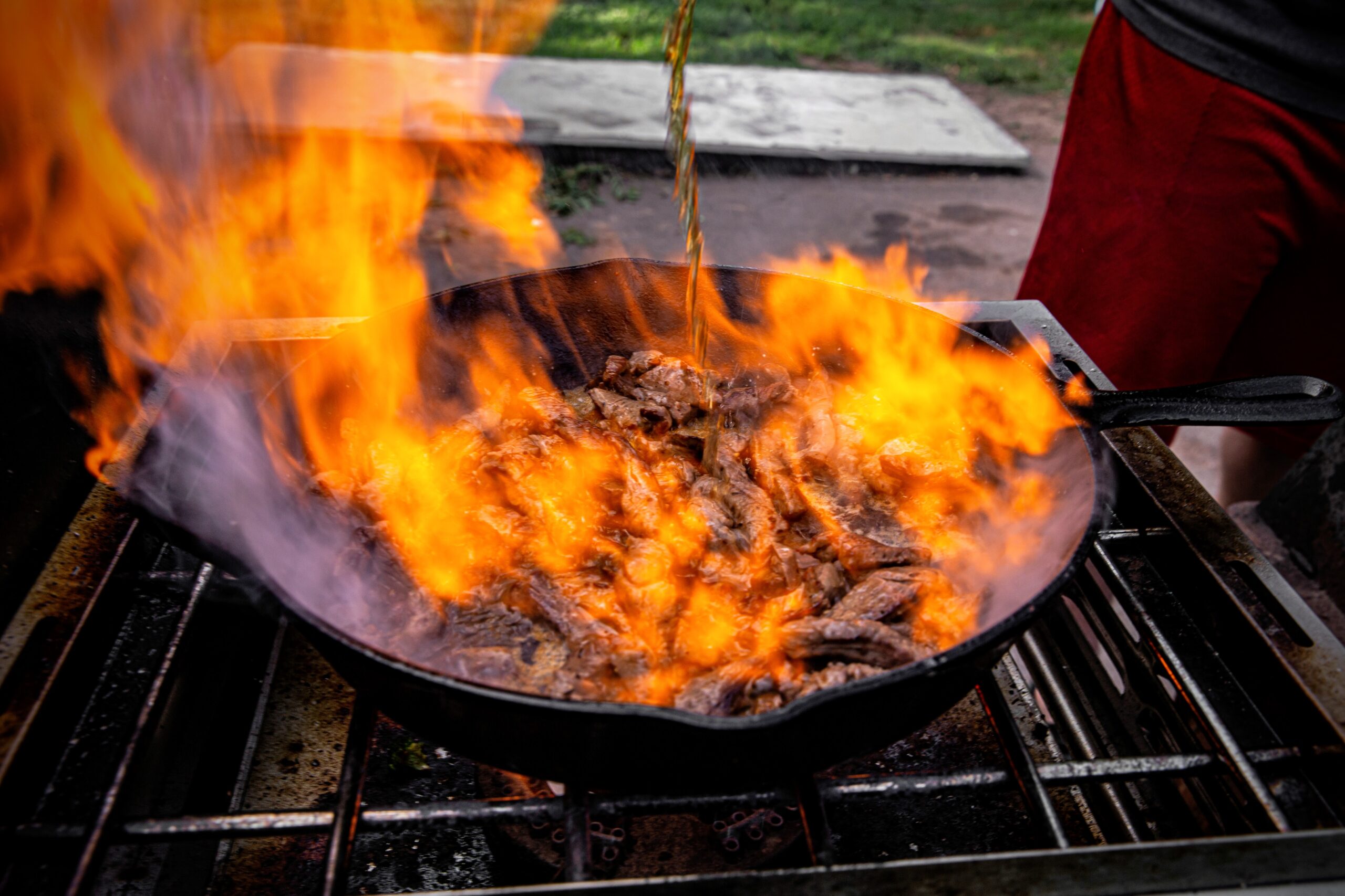 If you’re using high-alcohol-content spirits, like bourbon, know that an open-flame burner can create bigger flames when you add alcohol that is flammable. The higher the proof, over 80, the easier it is to light on fire. You can turn off your burner and still deglaze your pan (the pan will be hot enough). Also, consider just pouring in a shot or two and using that to deglaze, versus pouring in the high-proof alcohol from the bottle—any bit of splashing may cause flames to soar. Once done deglazing, turn the burner back on.