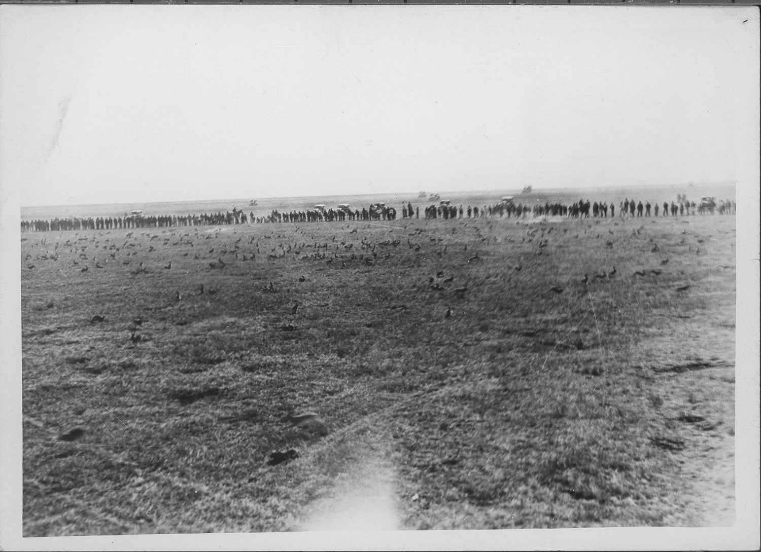 This particular drive was slated to comb four sections of rolling prairie. Organizers loaded nearly 80 volunteers (all boys and men this day) into cars and farm trucks, then dropped them off again along the perimeter. By the time everyone was in position, the hunters had formed a spindly square, each side stretching 2 miles long across the countryside. Then they started walking.