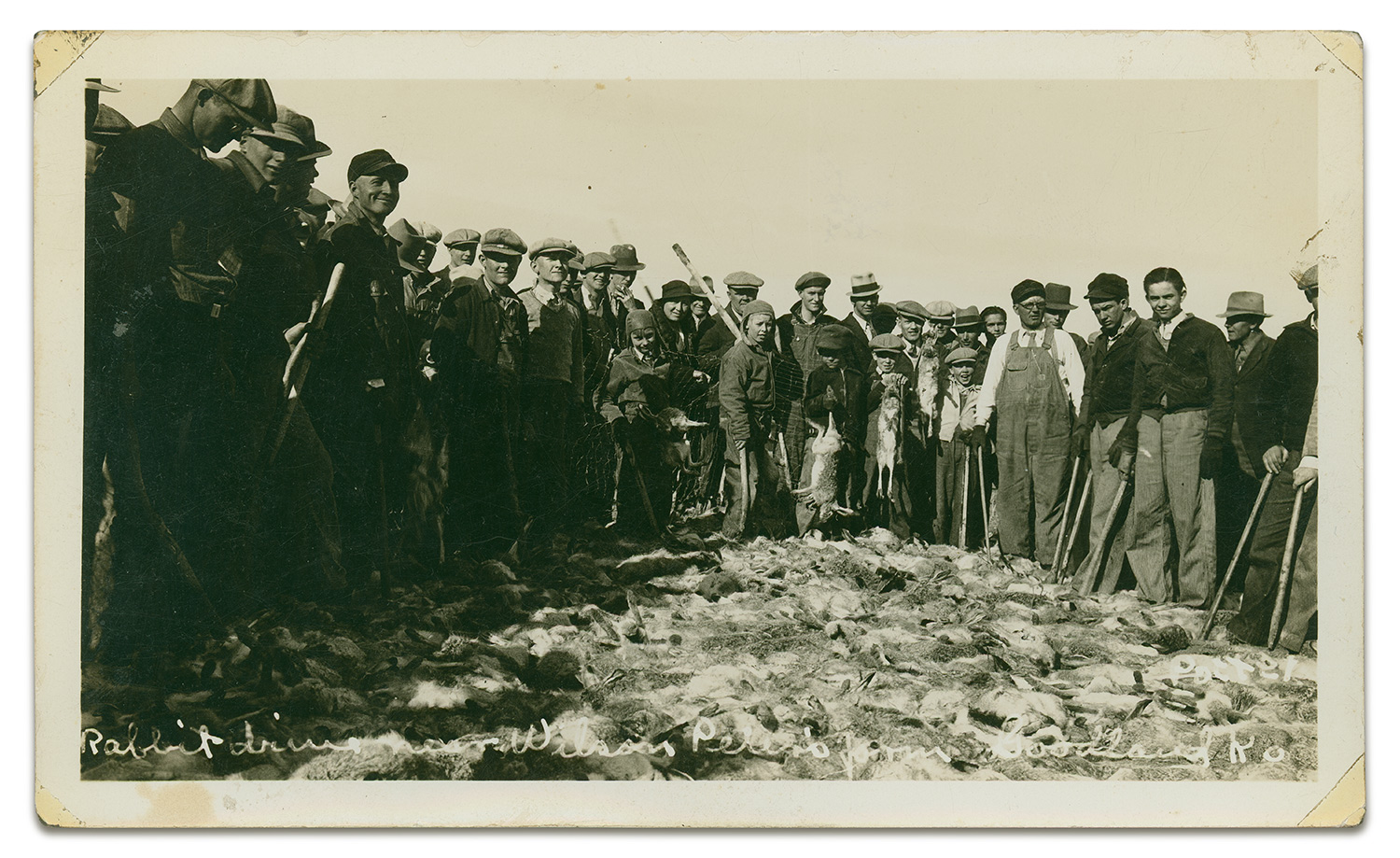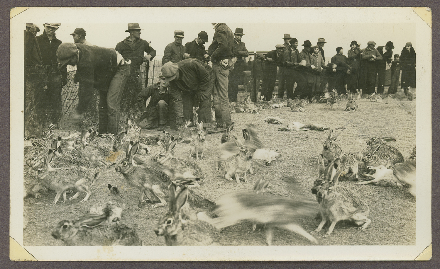“About 800 men, women and children, armed with ax handles, baseball bats, tire tools and golf clubs, stretched across a mile of the desolate prairie near Mud Lake and rounded up jackrabbits which they claim have done an estimated $5 million in crop damage” read one widely syndicated Associated Press article. “Many of the jackrabbits were beaten to death during the drive and others captured in a pen had their necks broken and their heads decapitated.”