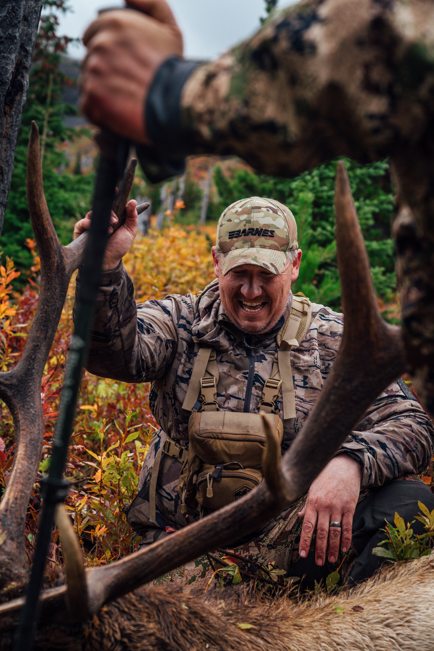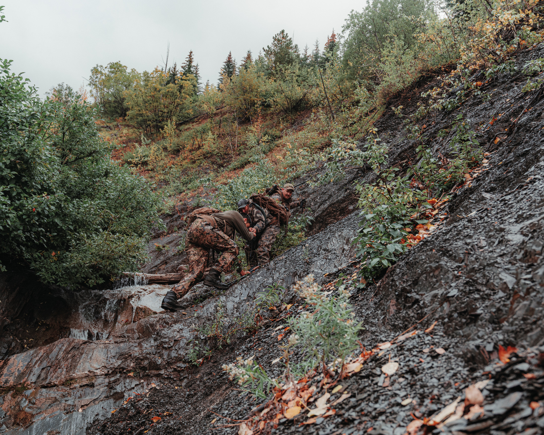 On day five we took the afternoon to scout for goats, and while glassing our guide Cassidy Caron spotted two bulls 3.5 miles away. If you could draw up a protected area where bulls could escape public land pressure, this was it. They were on a steep mountain with no trails, no road access, and surrounded by thick woods and deadfall. But there was a creek bed with tall walls on either side we could use to quietly get to the elk’s elevation. So that’s what we did.