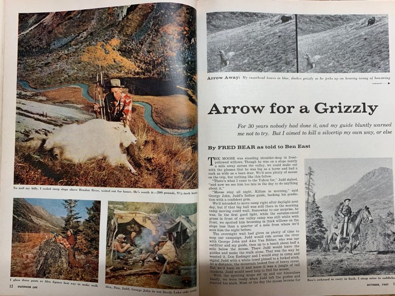 There are riflemen who deplore bowhunting for game that’s as dangerous as the brown bear, and others who criticize the bowman for getting into situations where he needs a rifle to back him up. I have an answer. If you want a trophy the easy way, take it with a rifle at 100 to 200 yards. But if you’re looking for the ultimate in thrills, go in and take your bearskin rug with an arrow at 60 feet. As for being backed, no hunter in his right mind is going to tackle a brownie with a bow deliberately unless he has a rifle behind him, in the hands of a man he can count on.