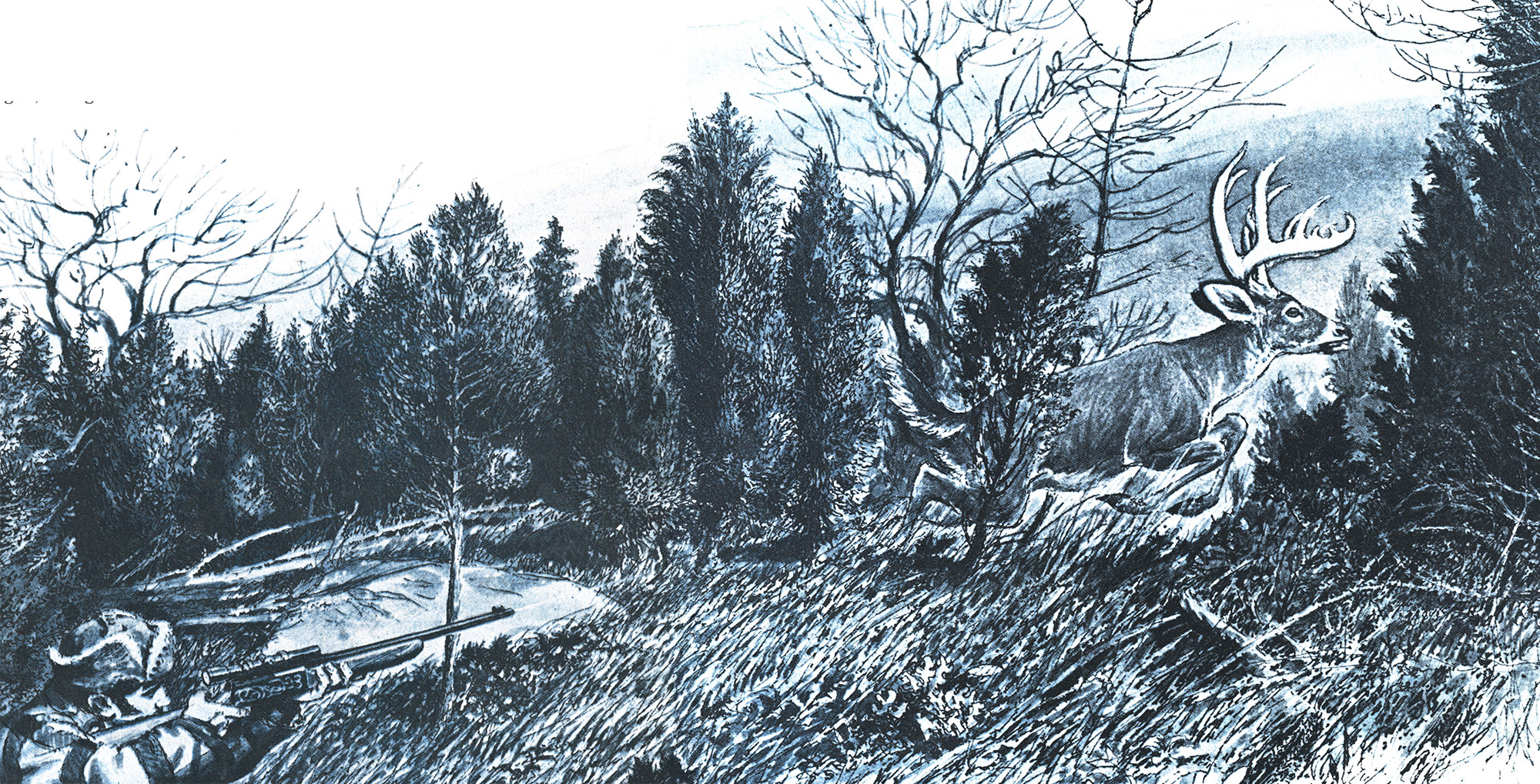 Dawn was a half-hour gone on that November morning in 1968. I wasn’t interested in the does, but I wondered why they ran into a small thicket when bigger woodlands were close by. Walking was so noisy that a quiet stalk was impossible. When I got within 150 yards of the thicket, the three deer hightailed out across an open beanfield and headed for a larger woods a quarter-mile to my right. I was watching them run when a sudden crashing of brush erupted where they had just been. I whirled around, but a buck was already jetting full speed along the route the three does had taken.