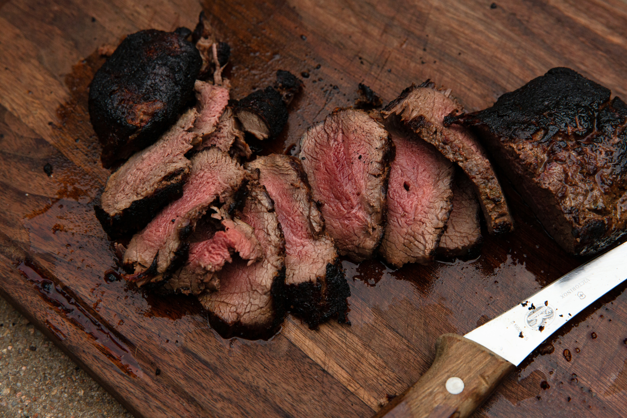 Conclusion: Some cooks prefer lump charcoal to minimize chances of ash coating the meat, but I didn’t have an issue with this. The carryover during the initial rest helped move heat through the meat—so much so that I could have let it rest for 5 more minutes and seared it again for 30 seconds per side instead of a minute. This would have minimized the overdone meat. Regardless, I do feel there was an interesting set of layers, from the crust to the outer ring to the middle.