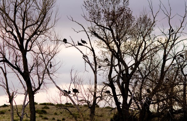 Turkeys fly up to roost at sunset and fly down sometime around sunrise. Between those two events, turkeys are looking for other turkeys or feed, or they’re trying to breed. They use vocalizations and their excellent eyesight to locate other turkeys.