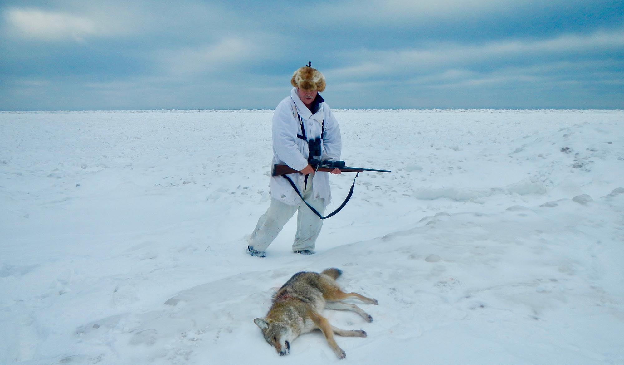 Windless days on the lake are unusual, but one quiet afternoon I saw a big dog heading west along the ice-covered shoreline. I knew there was a dead-end road access maybe three miles away. It looked like he was about halfway there when I saw him, so I drove down the highway past him, then cut down to the lake. I’d barely loaded my rifle while taking cover behind an ice berm when I saw him coming from a half-mile away. At certain points I could see him trotting across vast sheets of smooth ice. Other times he’d disappear in the undulating pressure ridges paralleling shore. I was ready to light the fire once when he was 150-yards out, but then he disappeared in mounds of ice. I was frustrated, knowing he was in shooting range, but I was unable to see him. Suddenly, there he was, 15 yards away standing on top of the ice ridge I was laying on, looking at the top of my fur hat just above my scope. That one still holds the record — by good margin — for my closest shot.