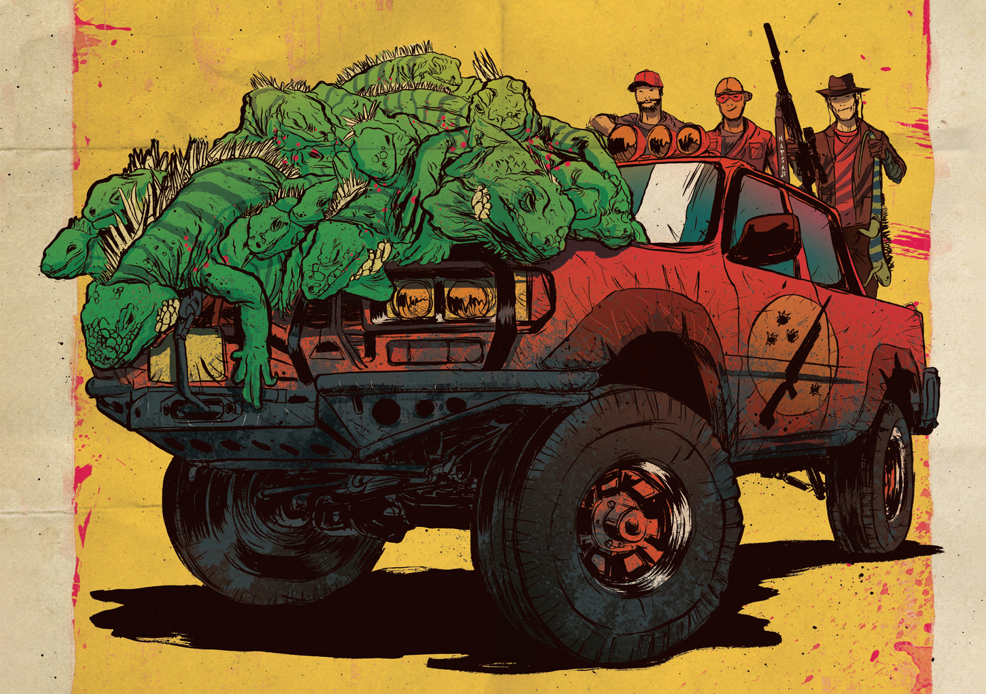 “We distribute our phone numbers around the countryside and tell people, mostly big-scale farmers, to call us when iguanas get out of control,” he tells me as I settle my crosshairs on an avocado-green 5-footer. “At first, we’d get a few calls a month, but now, we can’t keep up. We come to a farm like this one [outside Ponce], but it’s not possible to control them. We can kill 100 iguanas in a spot, and return a day or two later and kill 100 more.”