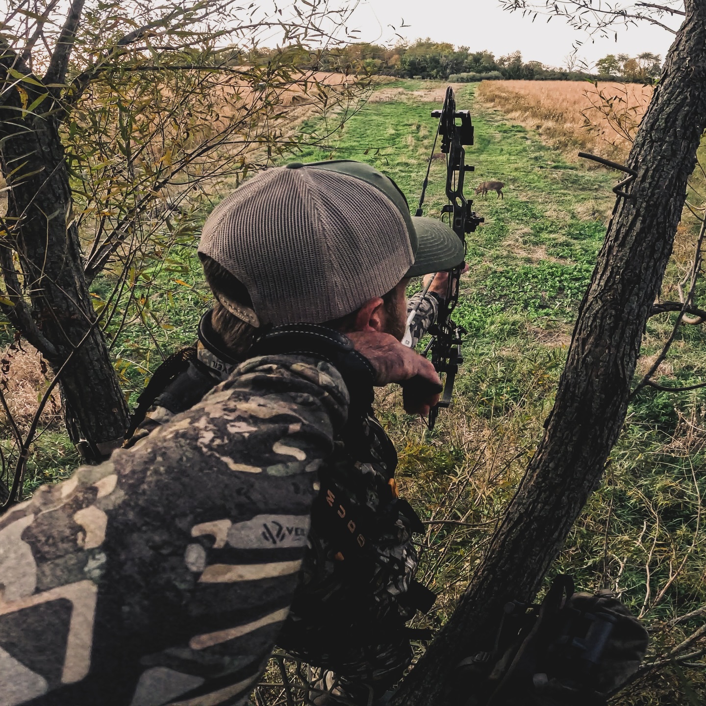Mills zooms in one camera tight to the buck and then reaches for his bow, a Hoyt Alpha X set at 65 pounds and firing a Day Six Evo 125-grain broadhead.