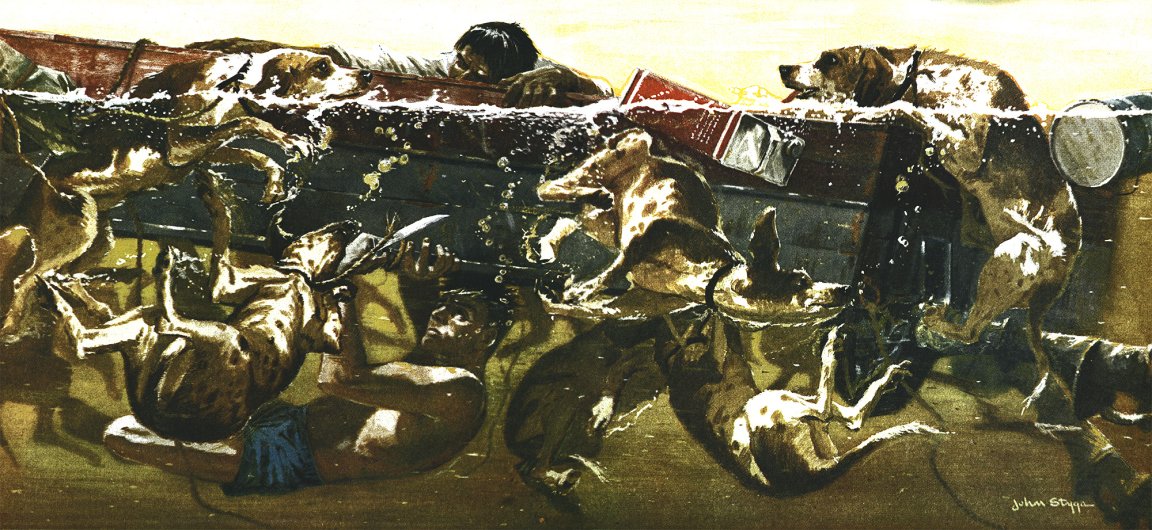 Dale and I stripped off our clothes and dived in with knives to cut dogs loose. The water was so murky I had to feel my way under the boat. The depths were full of struggling dogs. I cut as many loose as I could, came up for air, dived again.