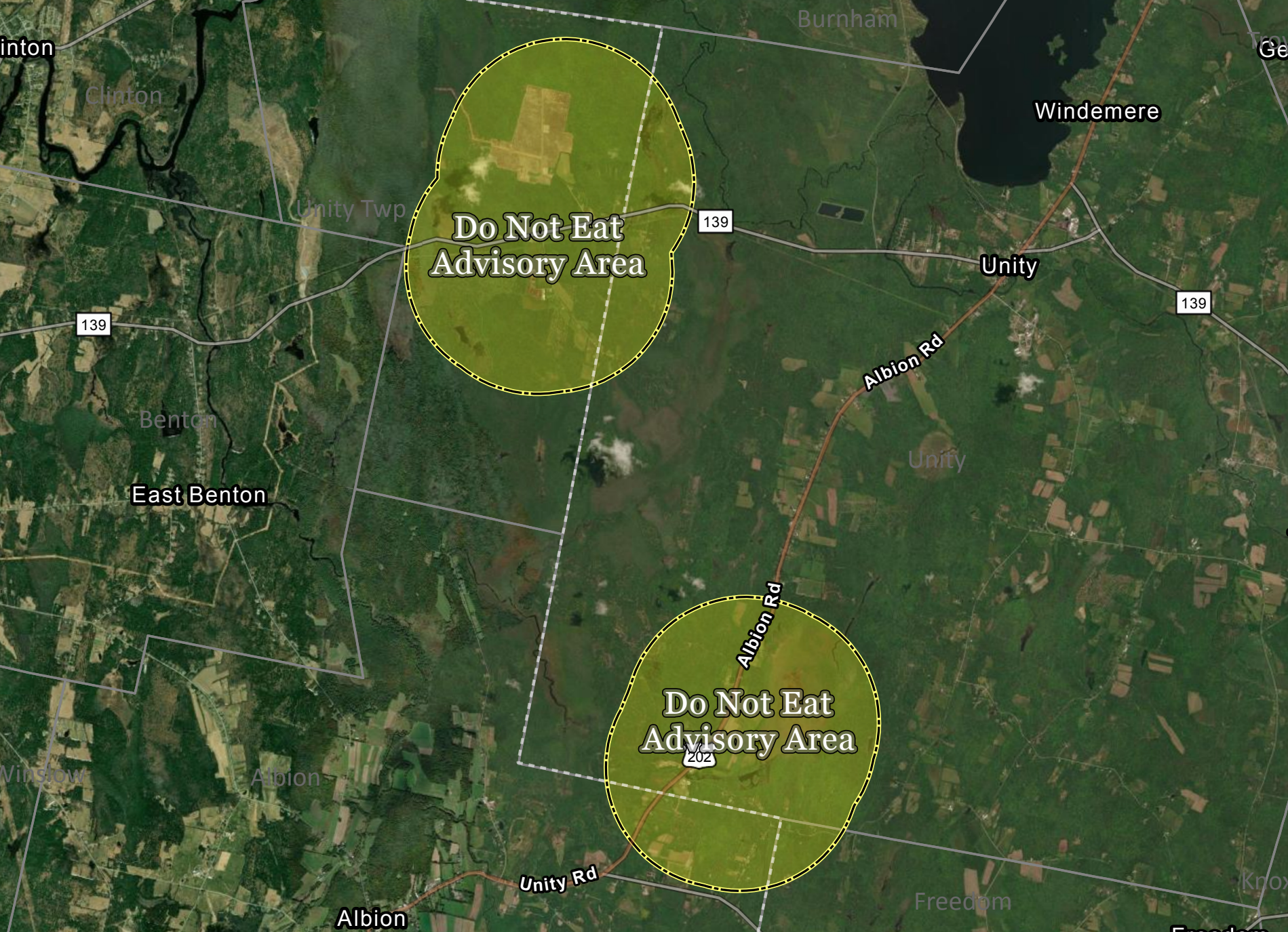 The state’s Department of Inland Fisheries and Wildlife and Center for Disease Control and Prevention issued a “Do Not Eat” advisory Thursday for two new locations in Central Maine. The two advisory areas include approximately 5.5 square miles in Unity and Unity Township and 4.3 square miles in Unity, Freedom, and Albion. This new advisory is in addition to a larger region that spans approximately 25 square miles in Somerset County, which has been under a Do Not Eat advisory since November 2021.